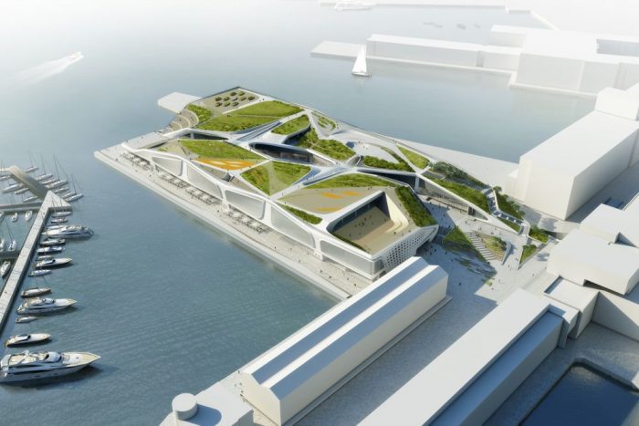 Featuring a program centered around wellness, culture, and leisure- the project will include a cruise terminal which, acting in conjuncture with its other varied functions, will bring a new vitality and liveliness to an aging harbour. As part of the added three-dimensionality of the project, the ‘roofs’ of the programs below feature a park with sporting fields, as well as beaches and other sites for public gathering and activity.