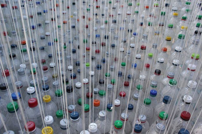In his eco-friendly architectural work titled (POP)culture, Britzman creates a canopy/carport from hundreds of recycled plastic bottles hung from a simple frame. A wonderful palette of colours are introduced into the project by a limited quantity of coloured liquid filling just the bottoms of the bottles. Through this, swaying fields of greens, blues and yellows float and sway overhead.