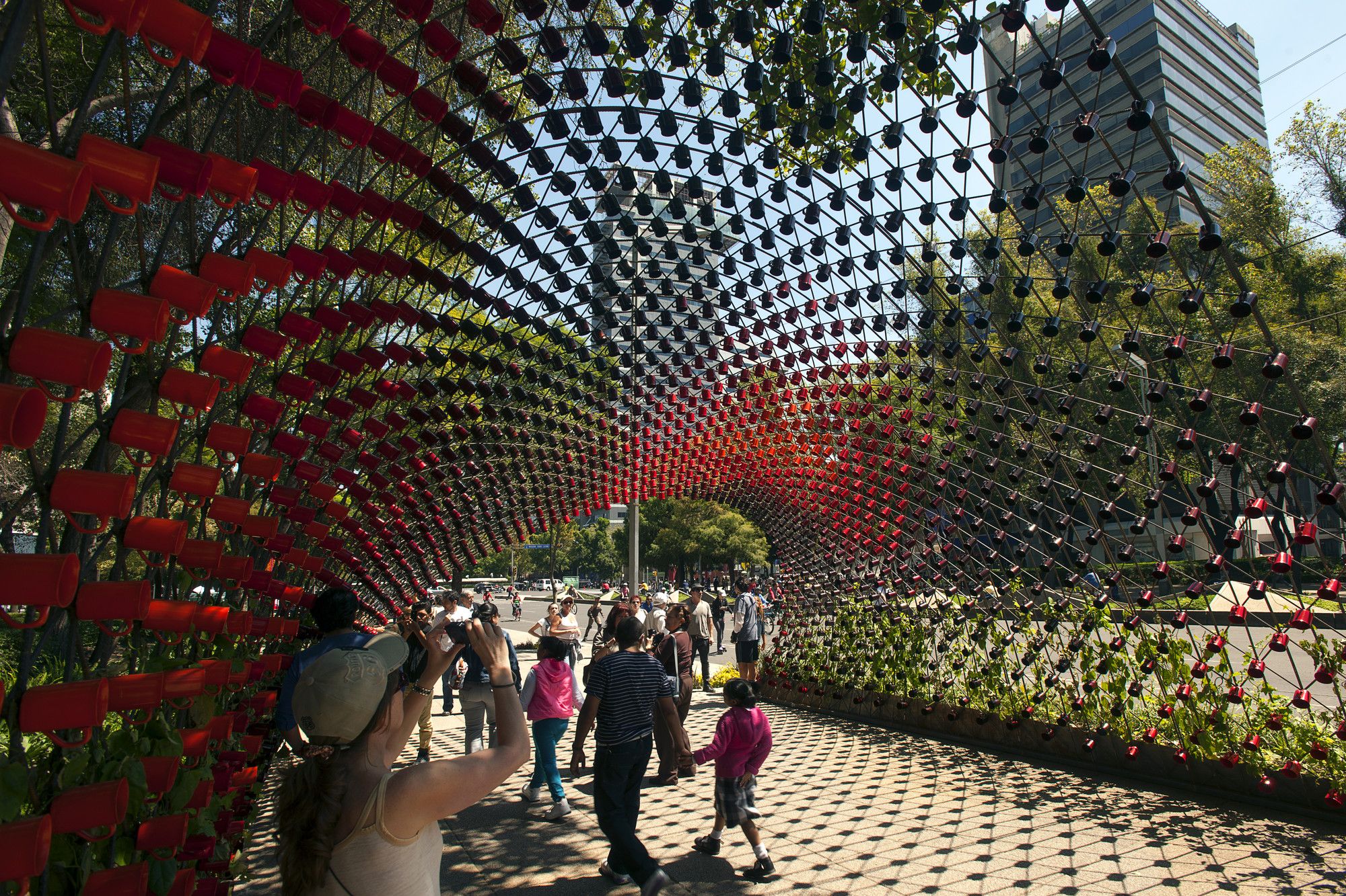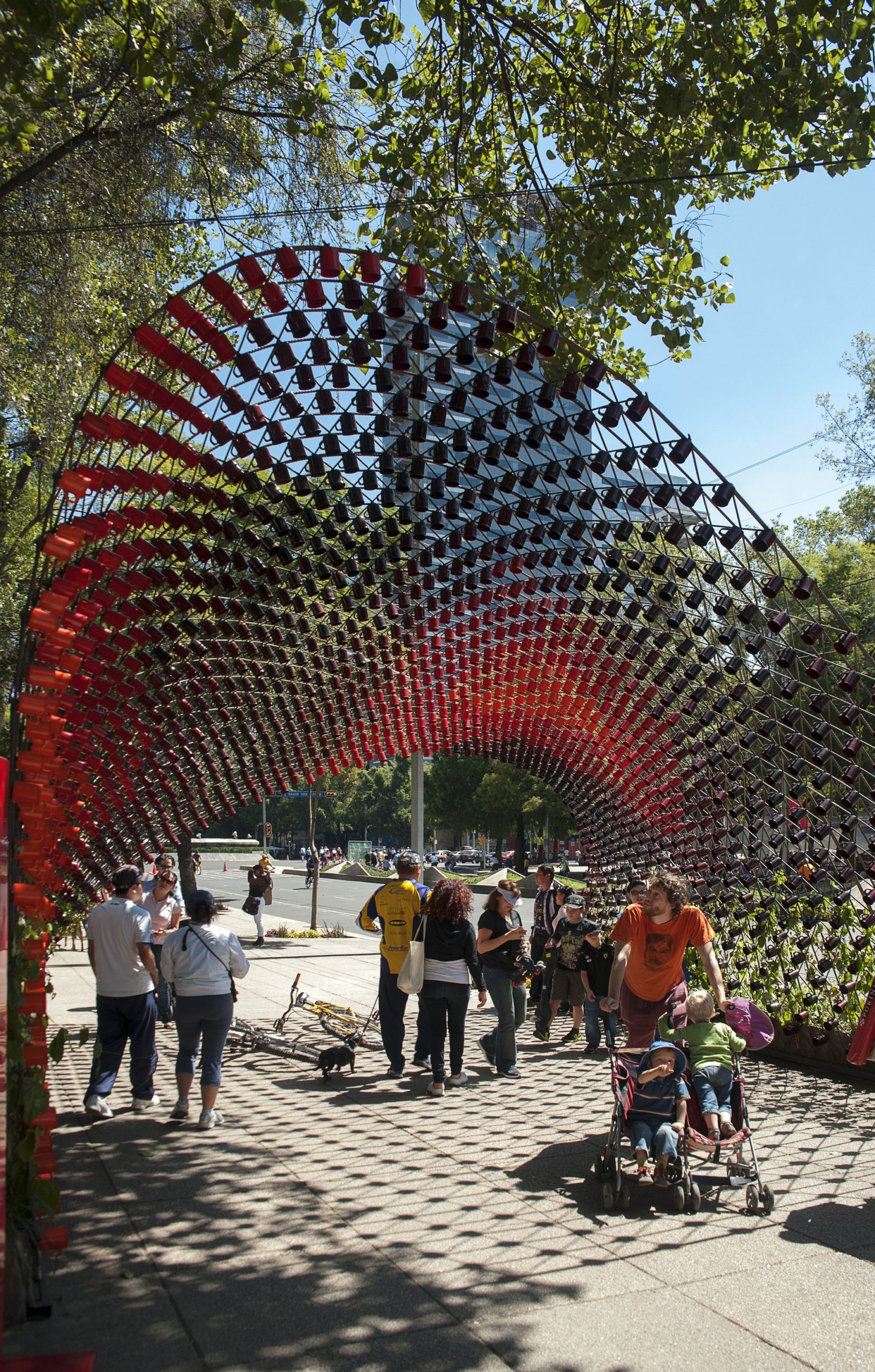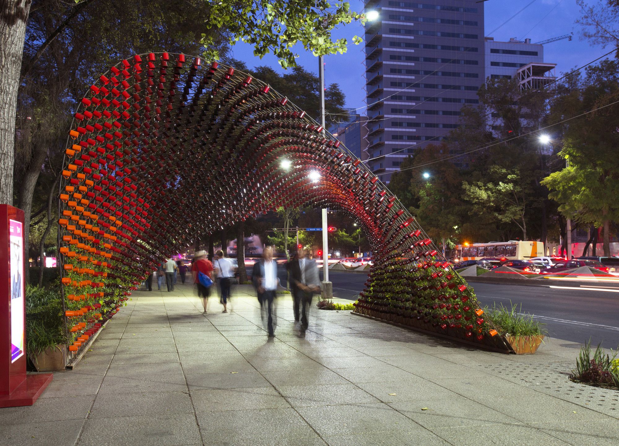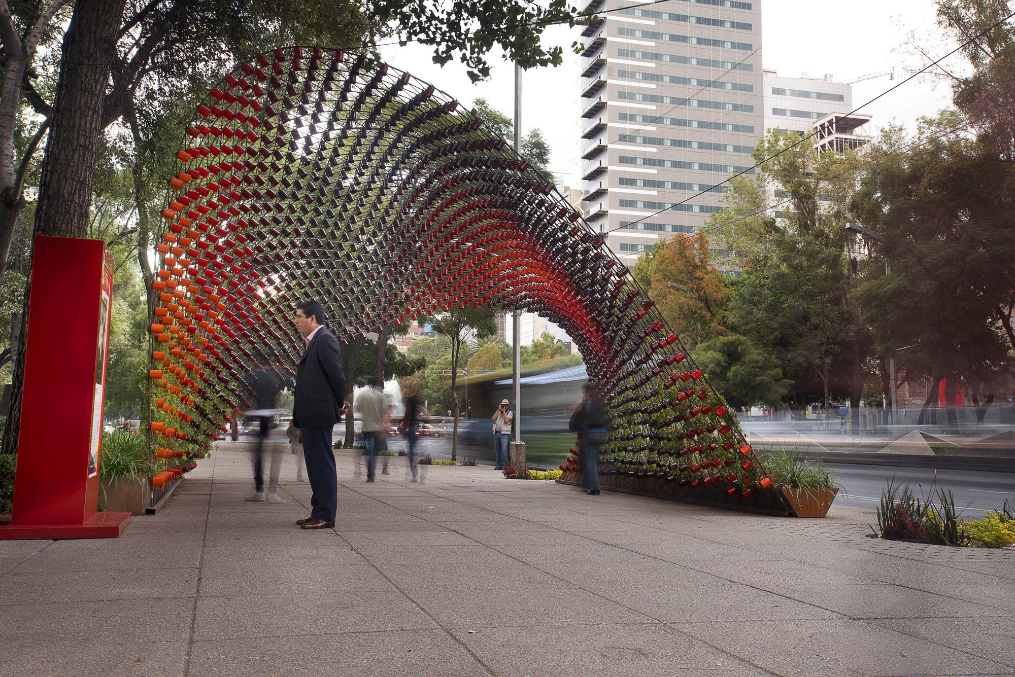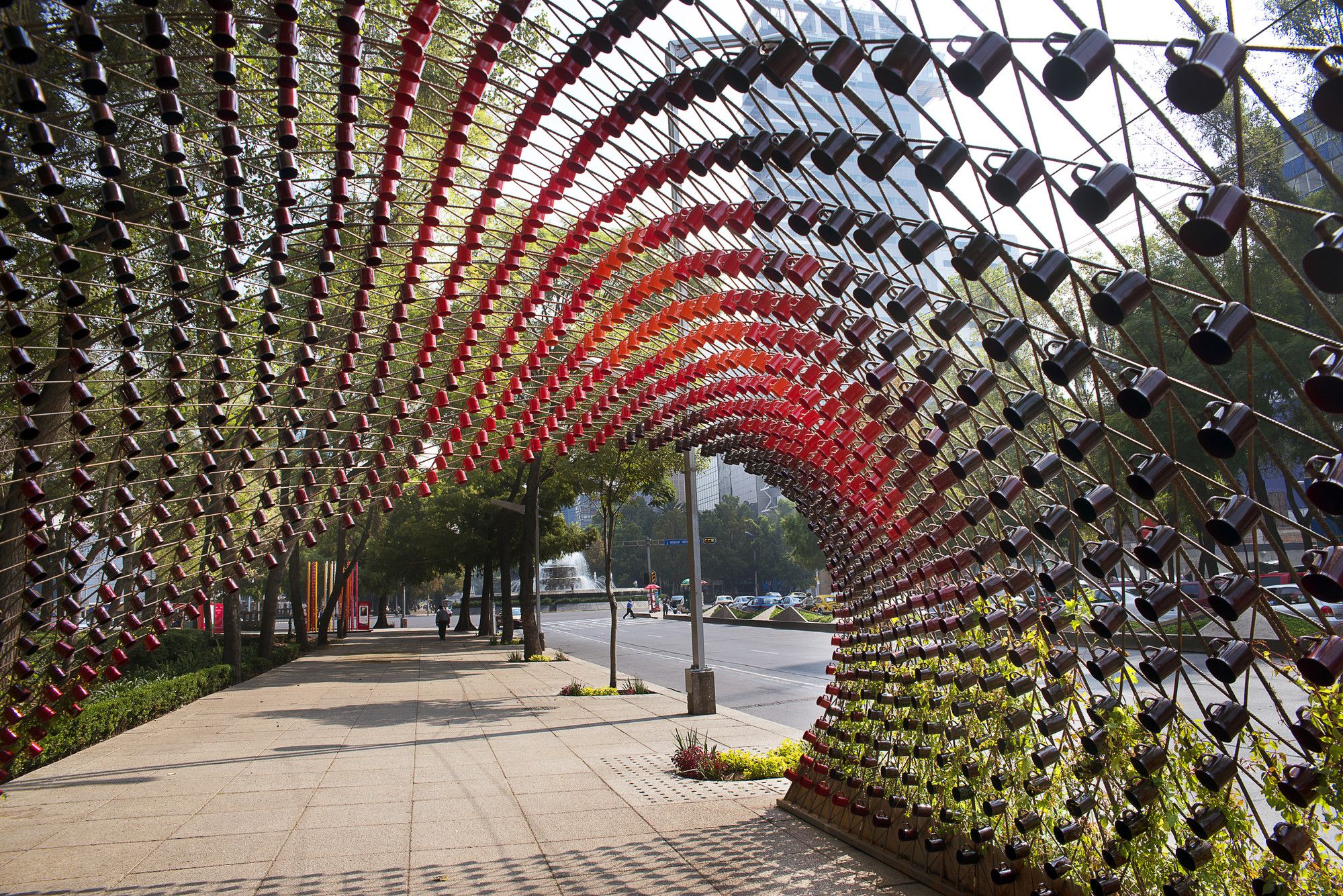 This portal, conceived through spatial design, activated by the city dwellers and the everyday stimuli of Mexico City’s life, becomes a new public piece in one of the city’s most important avenues, Paseo de la Reforma. Nescafé comissioned 8 artists(Francisco Serrano, Mario Schjetnan, Bernardo Gómez-Pimienta, Fernanda Canales, Manuel Cervantes, Alejandro Quintanilla and Alejandro Castro) to develop specific installations with the basic requirement of utilizing a maximum of 1500 metal coffee mugs.