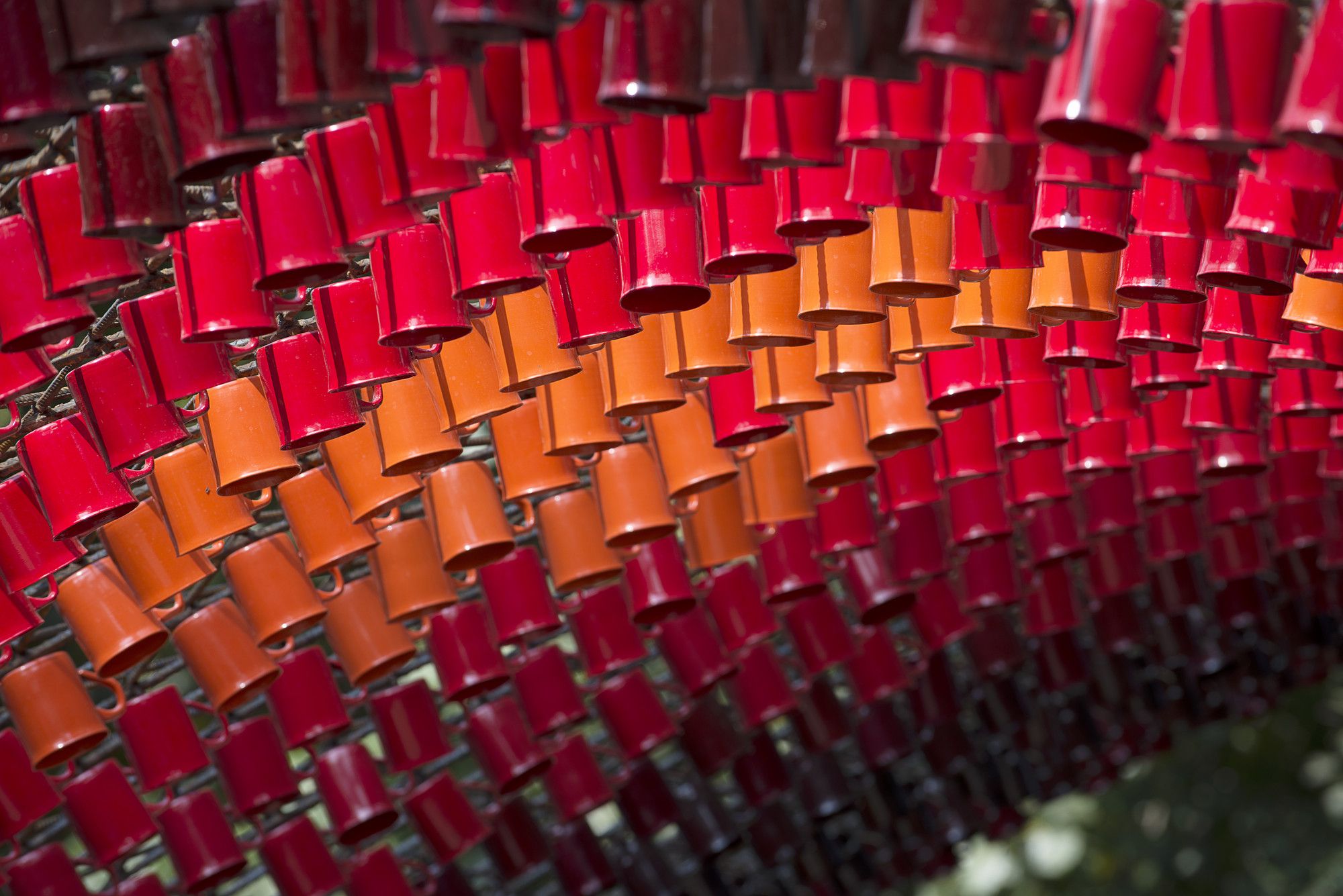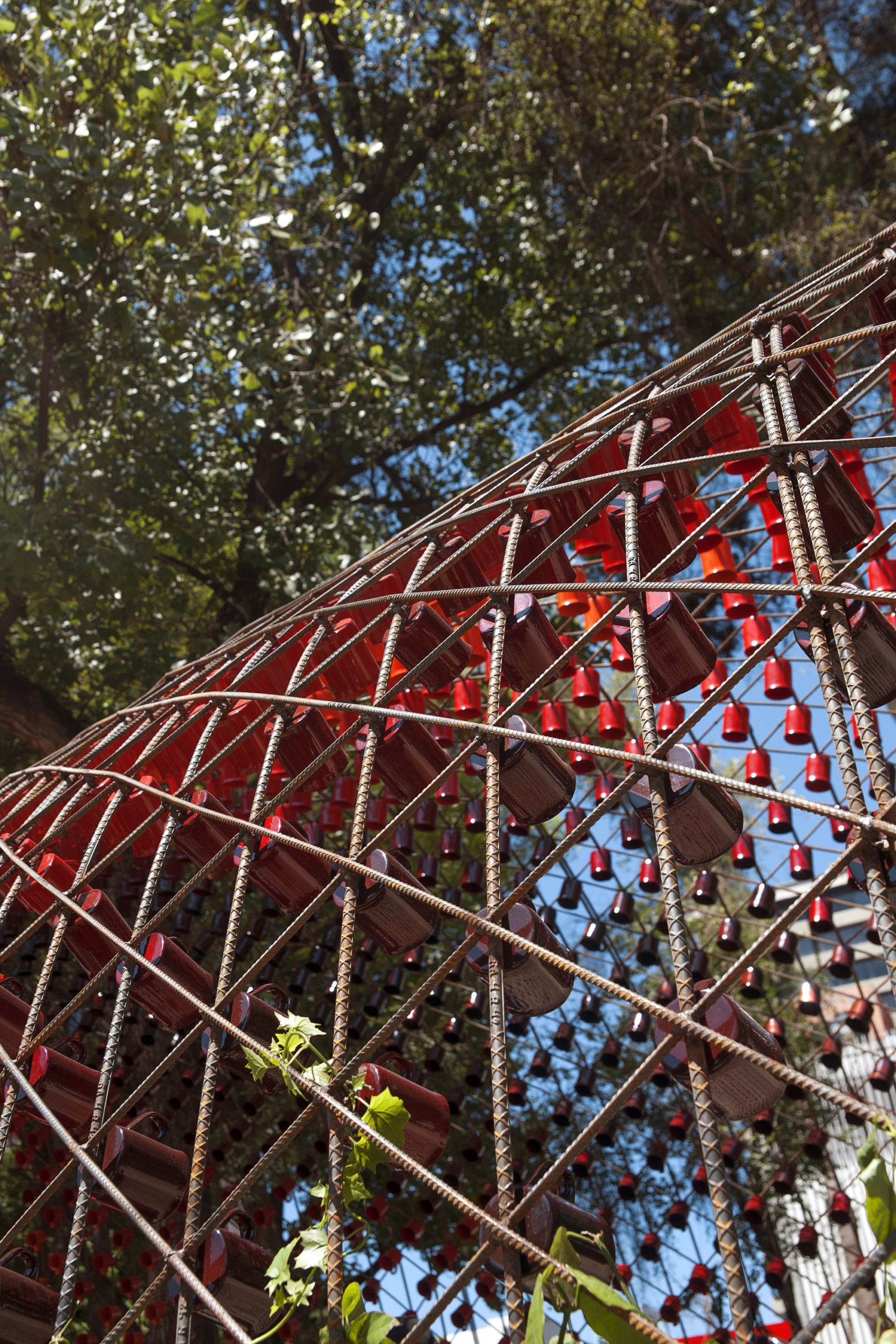 The final shape of the portal, along with the different colors of the mugs selected, reinforce the sense of movement of the piece, which plays a key role in the concept of the project. The steel planters anchor the structure and allow for the vines to grow in between the rebar, with the idea that in time it will cover the entire structure in a green foliage from the outside, while the inside displays the gradient of the mug’s chromatics.