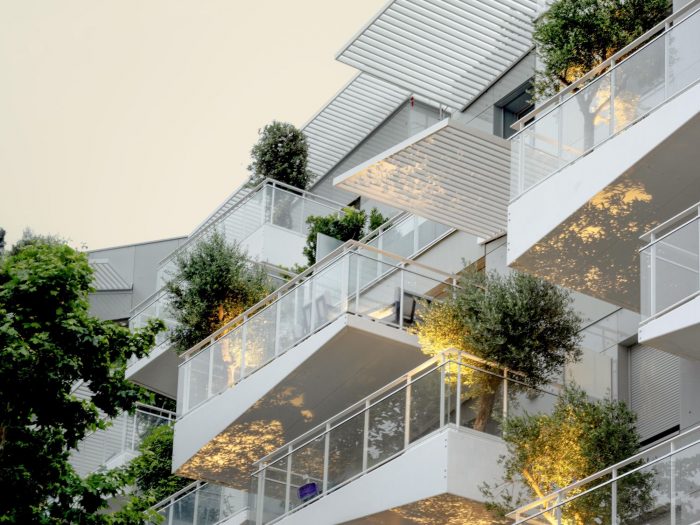 The advantages of these balconies go beyond their practical use; the play between their offsets and inversions and the combination of triangular prisms floating one above the other bring movement and lightness to the façade like a flight of birds.