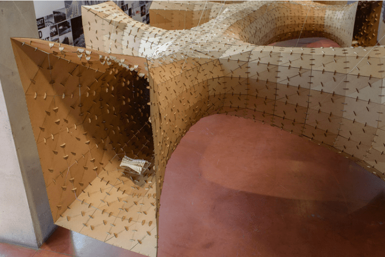 More than 2400 triangular custom pieces were cut with a laser, and then assembled using more than 6000 laser-cut clips. The pavilion could not be entered. Instead, it was used as a place for exhibiting models, at the ends of each tunnel. The interior of the installation has an interesting texture, thanks to the assembling clips that have contributed to creating more depth and better understanding of the forms. The contrast between light and shadow inside the tunnels has managed to create an unique atmosphere.