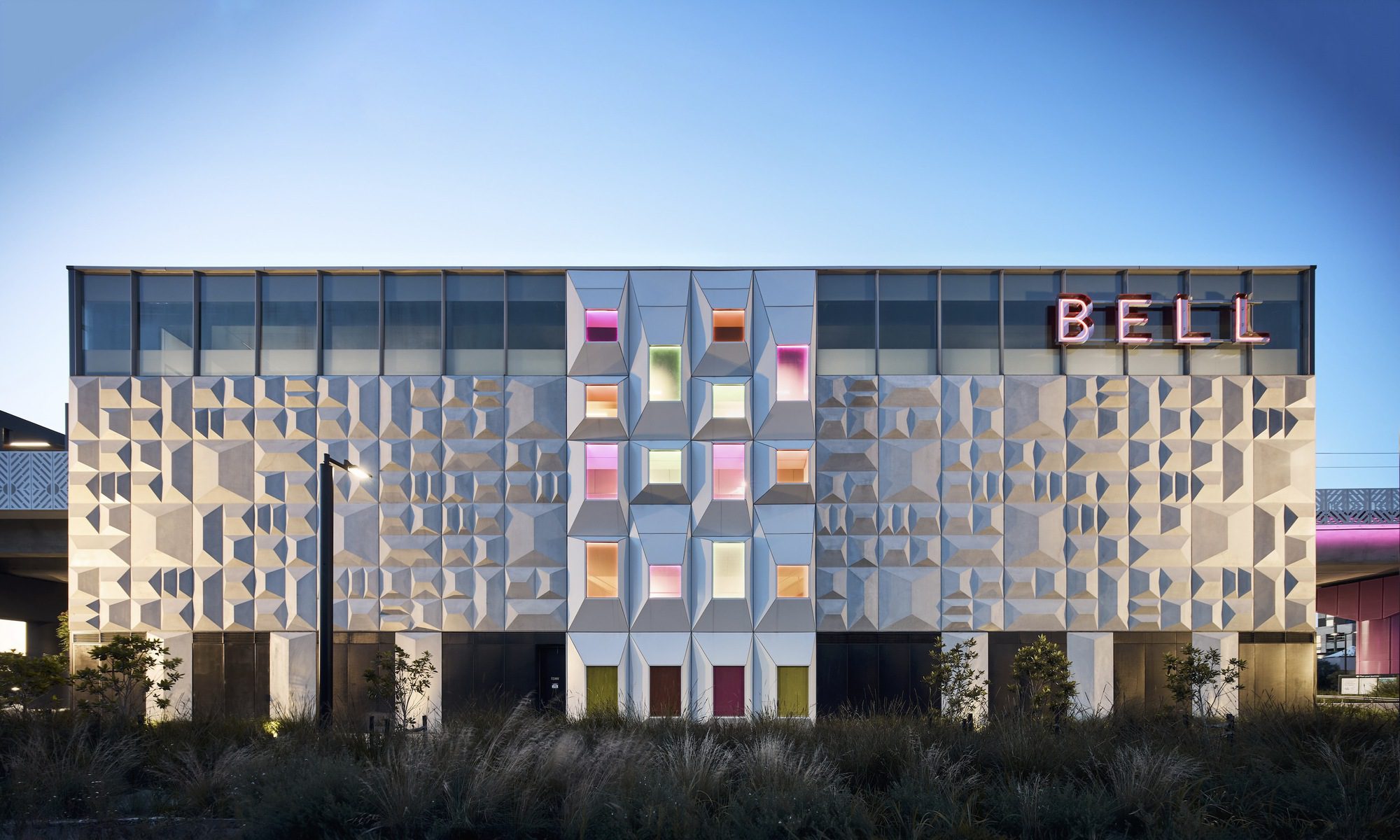 Bell Station’s façade references the heritage-listed housing stock surrounding the site. The City of Darebin’s roofscape was abstracted into a three-dimensional pattern that forms the concrete façade. The angled patterns animate the façade, which includes multi-colored glass windows that filter colored light into the double-height concourse space. These colors are drawn from hues that illuminate the neighboring Darebin Arts & Entertainment Centre and reduce the need for artificial light in the concourse. Bell Station’s development includes the design of a public amphitheater doubling as a flood basin. The dual-purpose space adjacent to the Darebin Arts & Entertainment Centre allows the existing community asset to extend into the station development.