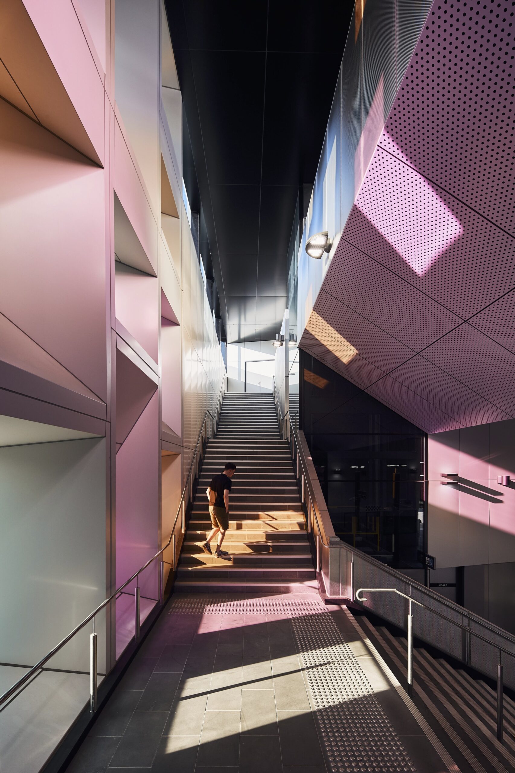 Throughout the project, color and form are used as tools for placemaking. The Mernda Line is attributed to a lilac identity. As such, pink and lilac piers and feature lighting perform as civic markers. As colors that do not naturally occur in the built environment, these identifiers enhance the stations’ prominence. The patterning, colored cladding elements, and lighting of both stations’ façades enable the buildings to perform as placemaking mechanisms and celebrate rail as a piece of public architecture. Both station designs champion environmental consciousness seen in the station’s sustainability credentials, including meeting the highest ISC for rail projects and 6-star Greenstar requirements.