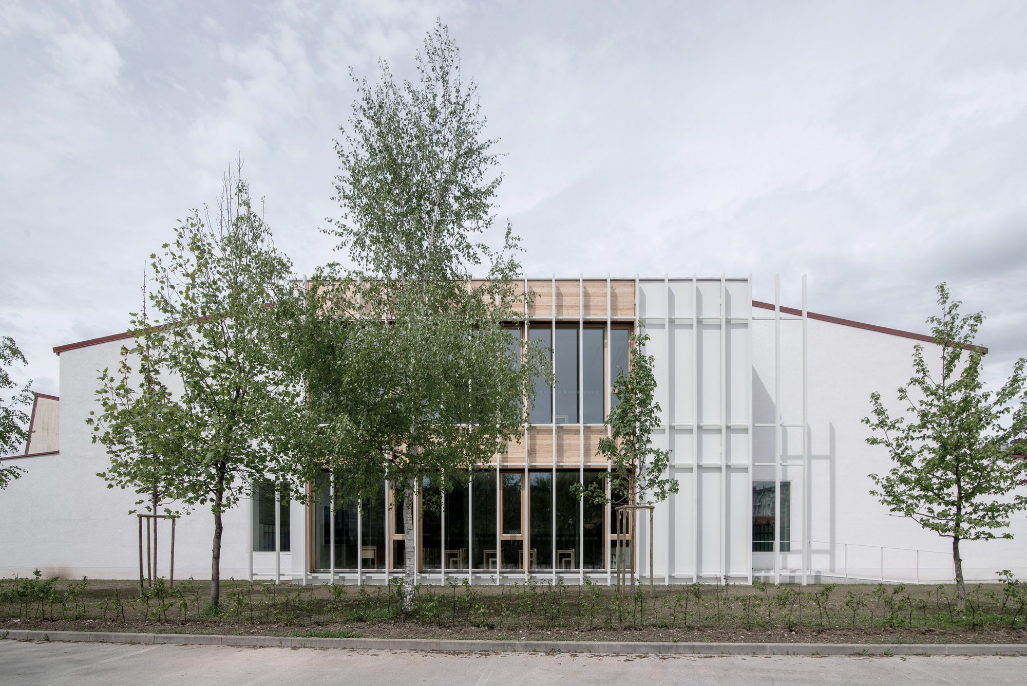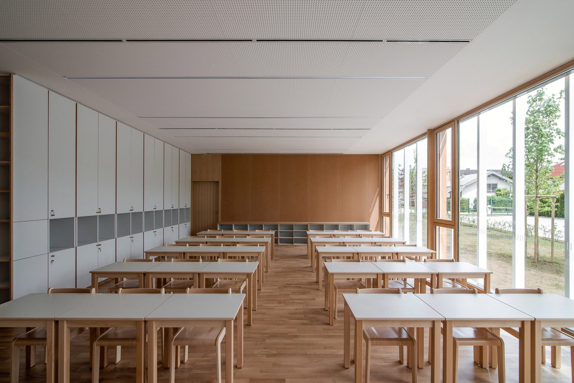 The intervention is designed as an insertion between the two existing side façades, which were renovated during the construction. The whole eastern façade is thus treated as a single façade. The new element is visibly added and extends beyond the existing façade plane. A façade of vertical slats is therefore added, extending beyond the basic volume on both sides and softening the transition between the new and the old part. The classrooms are made from natural materials. In addition to wood, the walls are covered with cork, which is used by pupils and teachers as a display surface with unlimited possibilities. The large windows in the classrooms overlook the green area next to the school, where additional trees have been planted. Children will be able to hunt, hide and play among the trees, from the ground floor classrooms they will be able to see the scattered trunks and the shade of the treetops, and upstairs they will have the feeling that at least part of their lessons are taking place in the treetops. The view of them is just as important as the view of the blackboard. Being dreamy is also part of learning.