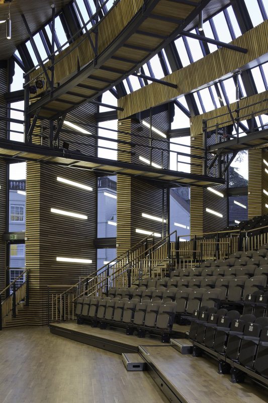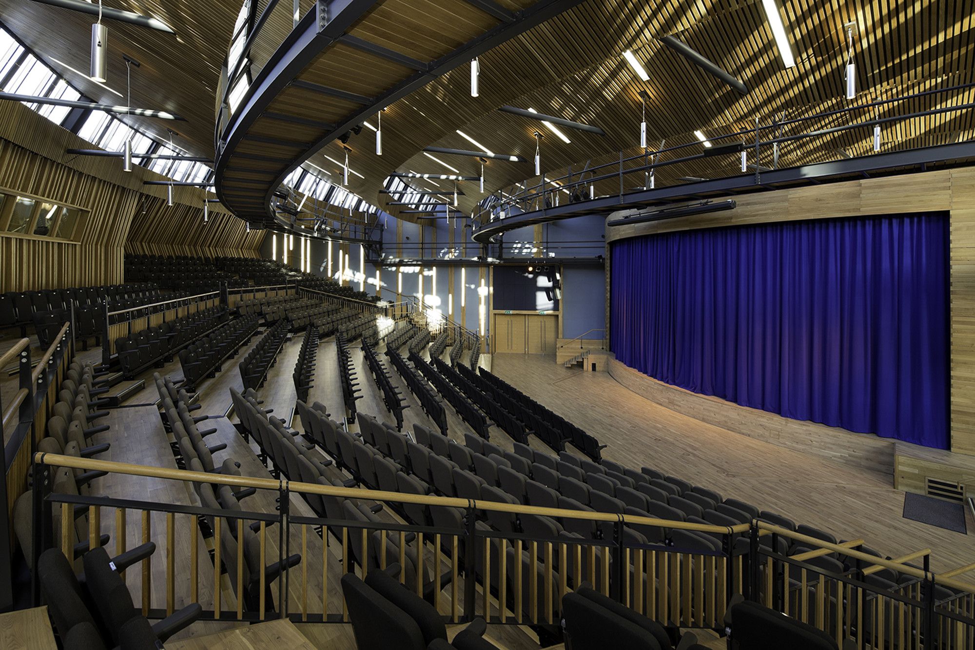 The flexibility of the Auditorium was achieved through the use of robust acoustic separating constructions and specialist fit out equipment, such as telescopic seating, an acoustically separating sliding proscenium partition which divides the Auditorium and Stage Studio Theatre into two independent teaching spaces, and an orchestra pit elevator able to be set to various levels.