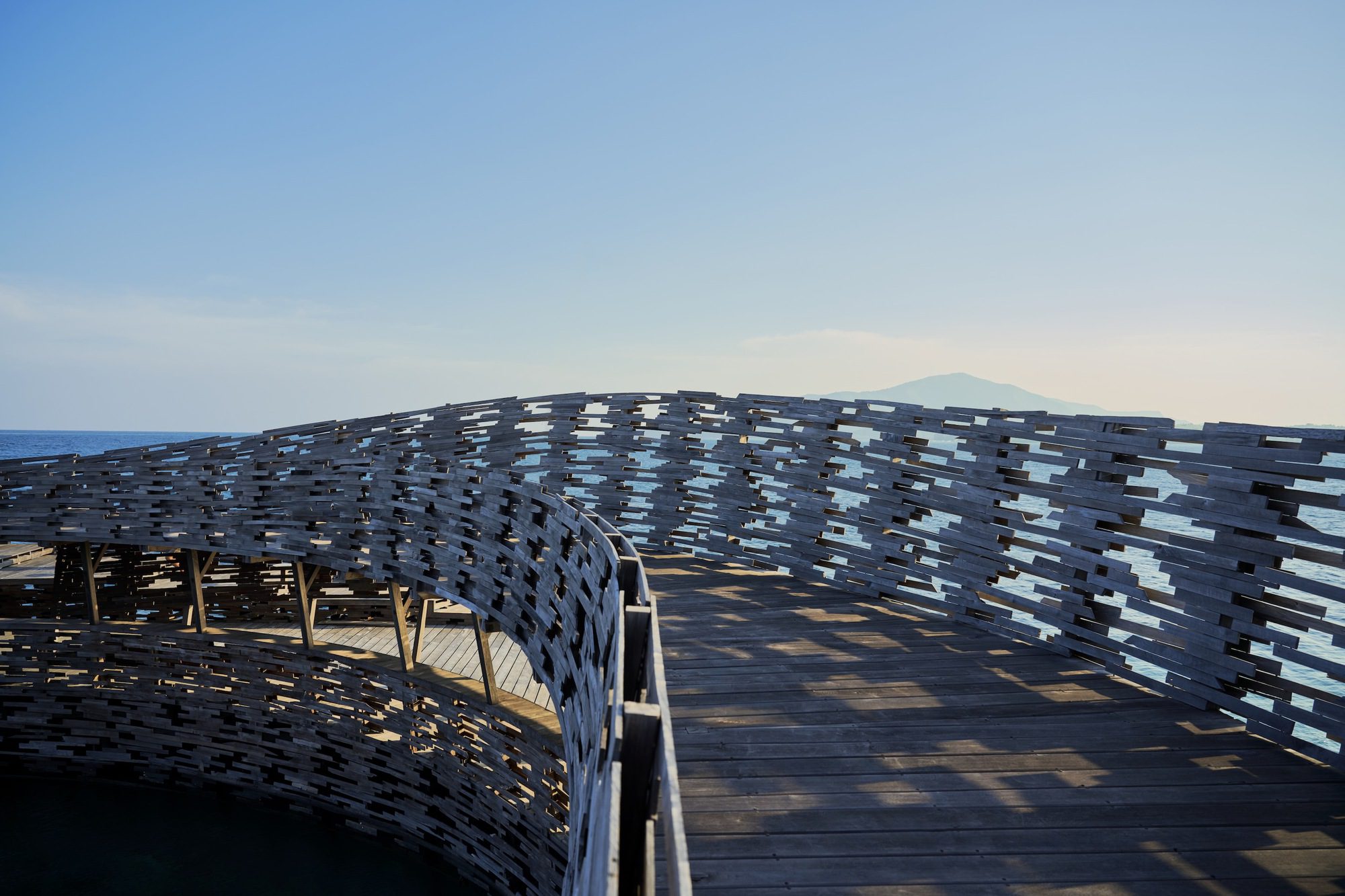Pusaran is an experiment aimed at understanding how to construct a space in the middle of the ocean using only reclaimed ironwood in its vernacular system. Located on a private island in the Karimun Jawa archipelago, the client wanted to expand their existing shark observation pool into more tourist-friendly spaces despite the challenging site that is generally considered unsuitable for construction without any intervention to the ocean floor.