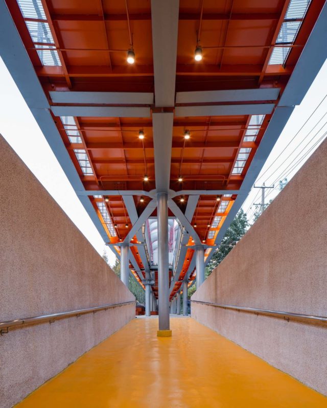 We consciously designed a series of lightly structured arc canopies, membraned for sunshade. The membrane is not waterproof out of two considerations: first, we encourage to feel the nature in such a linear open park; second, technically, the canopy would bear more wind load if membraned waterproof, making the structural comparison invalid of lightness of canopies and heaviness of the Highline. Arc canopies are reminiscent of railway platforms by which traditional trains slowly pulled in. There were many forms of railway platforms, and we chose one of the simplest and colored it in five different ways. With the same form but changing colors, the light structures afford clear zoning for the park. Blue here and pink ahead, visitors can easily locate themselves through these arc canopies.