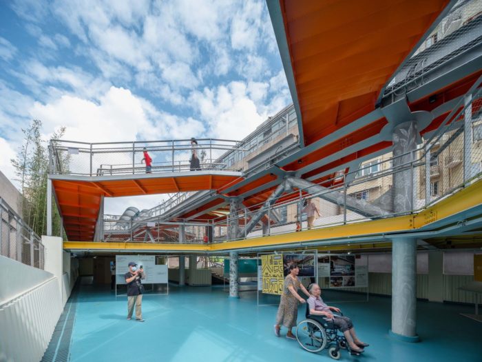 We took a long time in color matching, with no clear idea at the beginning. We hoped it mild and fitting on the whole, while worrying that mere silver or grey color cannot convey the energy of communities. We tried more than 10 schemes of color combinations and finally decided to keep the main structure silver-grey and paint the inner sides orange, in hope that the color comparison would express a sense of vigor. We considered especially space under 1.4 meters high. The semi-basement, differing from light and open ground floor space, is dark and narrow. We chose the combination of silver-white and yellow for the dark to make it harmonize with places above the ground. The silver-white color is somehow like pearl, mixed with much metal powder, looking apparently different from the silver-grey color painted on the structures above. We weighed the experience in the semi-basement over the unitarity of colors, a decision unlikely to be made by most architects. This challenge is unprecedented for us and demands some breakthroughs.