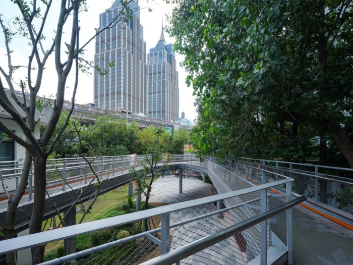 In the 880-meter-long park, divided into the north and south parts, 10 scenarios are conceived to serve public functions such as gathering, activity, entertainment, leisure, sports, etc. Spreading from the middle to the north and south ends, the corridor connects social energy and forms multilevel spaces in separation from yet with dialogue each other. The north gate is the main entrance. With the nearby Lianong Building’s and Zhongqiao Tower’s façade design integrated, the ground floor level and the Highline define together the entrance, facing Caoyang, like a city hall, where visitors can stroll and overlook. In the middle passes a double-line highway over Lanxi Road, integrating the park’s walking experience on both sides. Life on streets with walking residents and running cars all together then consists part of scenes in the park. A circular corridor connects two ways of the Highline in the south section, with two hackberry trees standing through voids among the structure. With branches stretching and leaves tangling, visitors can touch the green while walking on the Highline. We hope for as much green as possible in the park. Planting some trees, some grass, and some flowers makes it an ivy of steel.