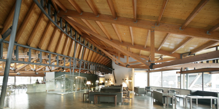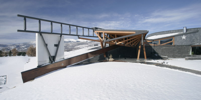 Pyrenees Golf Club and Social Centre designed by MiAS Arquitectes, The building is well integrated into the landscape. Thanks to construction techniques, special materials, camouflage, and the typography, the building seems to belong to the site.