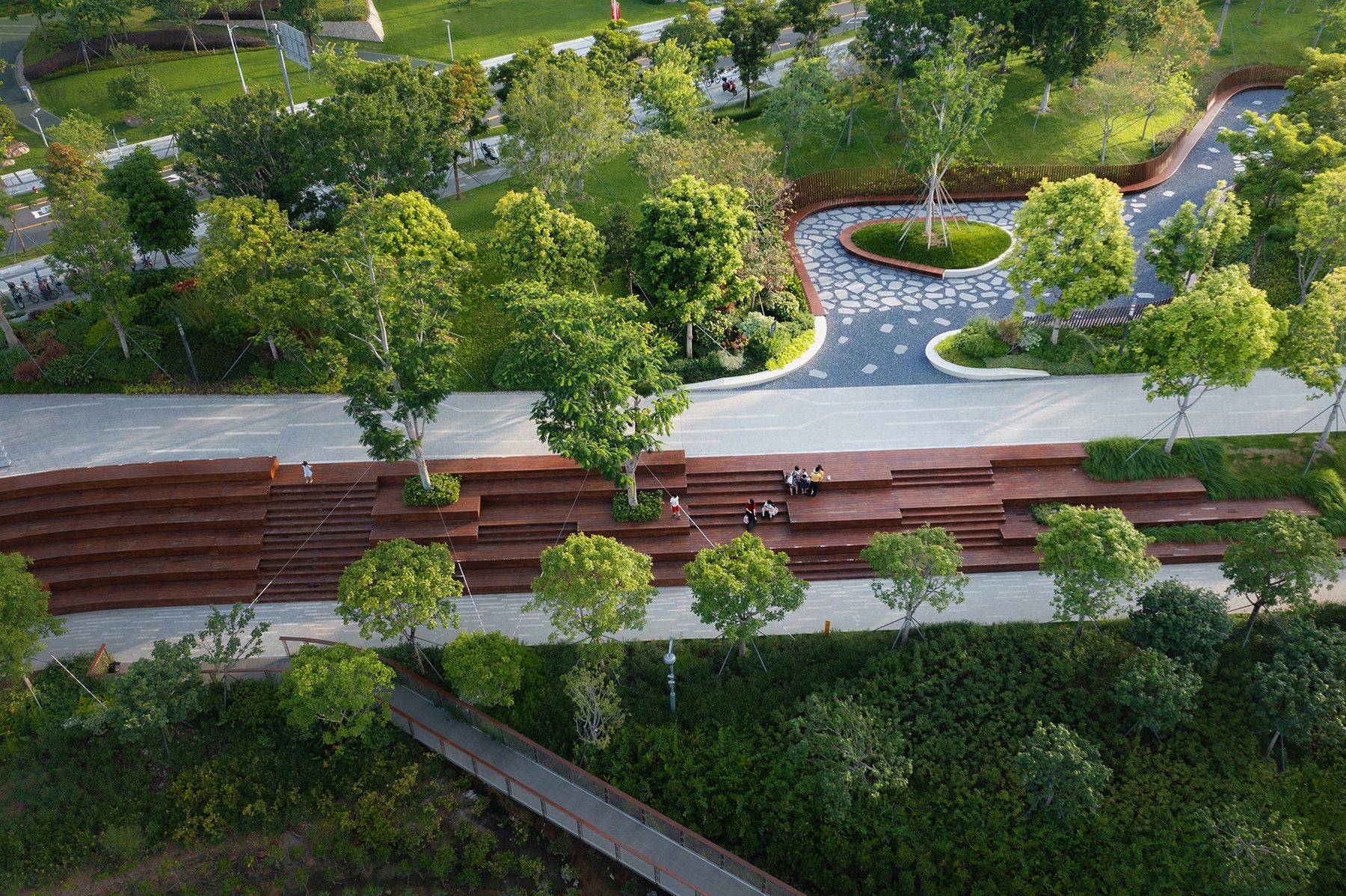 Smart Park. Guiwan Park incorporates technology that monitors soil, irrigation, insects, water levels, and tree conditions. This data is used by maintenance staff to support operations and monitor as the park’s species develop and mature. The same data has been used in partnerships with local institutions to better understand ecological restoration within urban environments, using Guiwan Park as a case study. In addition, an app for visitors allows them to navigate the park with a digital fly-through and learn more about its ecological benefits.