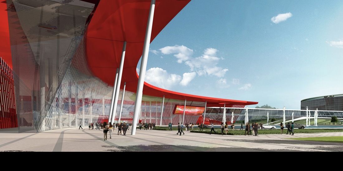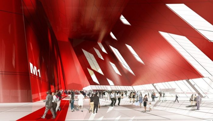 Organized into an “L,” two wings of expo halls, ten total, linked by a vast canopy, shelter a public plaza that can be used for large outdoor events. At the corner, a dramatically curved main entrance faces outward to welcome visitors to the expo center. Each of the column-free halls can be subdivided into two smaller, square halls, allowing maximum flexibility in planning a variety of events.