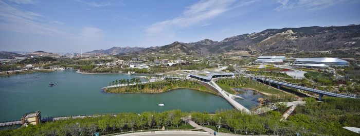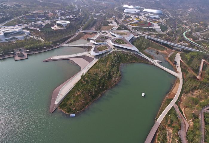 International Horticultural Exposition, 2014  took place in the Qingdao province of China for which a Beijing based studio, HHD_FUN designed ‘the heavenly water service centre’ QINGDAO’S SERVICE CENTERS  as one of the two large complexes within an area of 8,500 square meters. As the primary architecture of the site, these buildings serve a multifunctional purpose with facilities such as activity centers, restaurants, circulation hubs, recreational landscapes, cultural communication, exhibition etc. The service centers are placed on same axis as that of site’s Expo theme pavilion. The service centers have been designed such that they are connected with main pavilion while enhancing its draw from closer proximity.