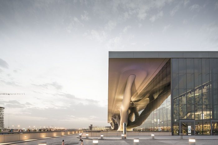 Bent steel plate creates the forms of spanning structures that resemble the native Sidra tree and come up to support the overhanging roof structure. There are 10 performance venues, among them a 4000 seat conference hall, a 2500 seat theatre, several three-tiered auditoria, 40,000 m² of exhibition space across nine halls and 52 meeting rooms. Gotta have the meeting rooms, because who wants to shout across 4,000 seats when there are only ten of you?