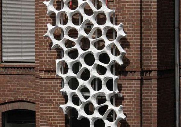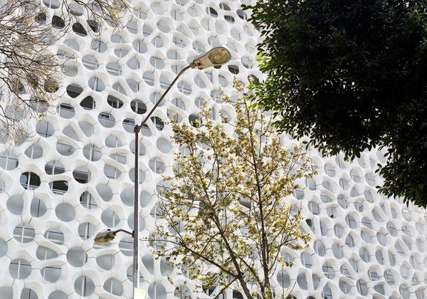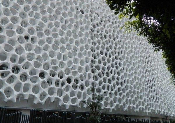 The new outter skin appears to be a perforated surface organized in a mathematical, cell-like arrangement. This unique façade tests some prosolve370e panels that are made up of photocatalytic pollution-fighting technology in urban environments.