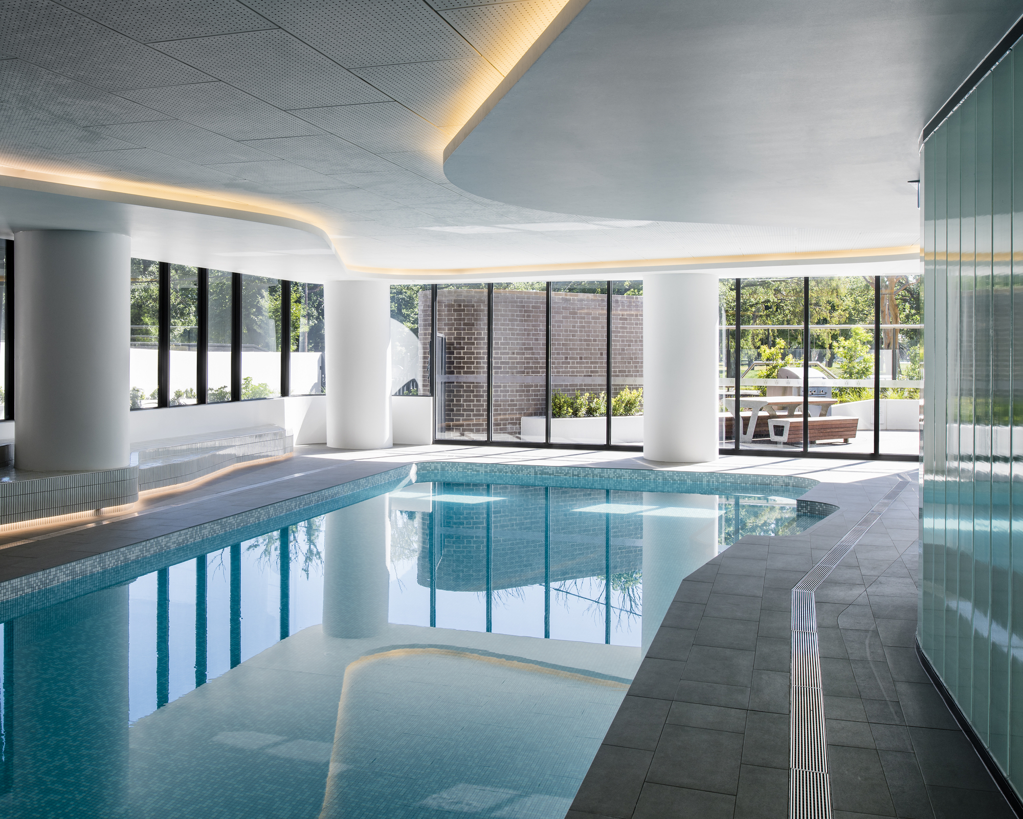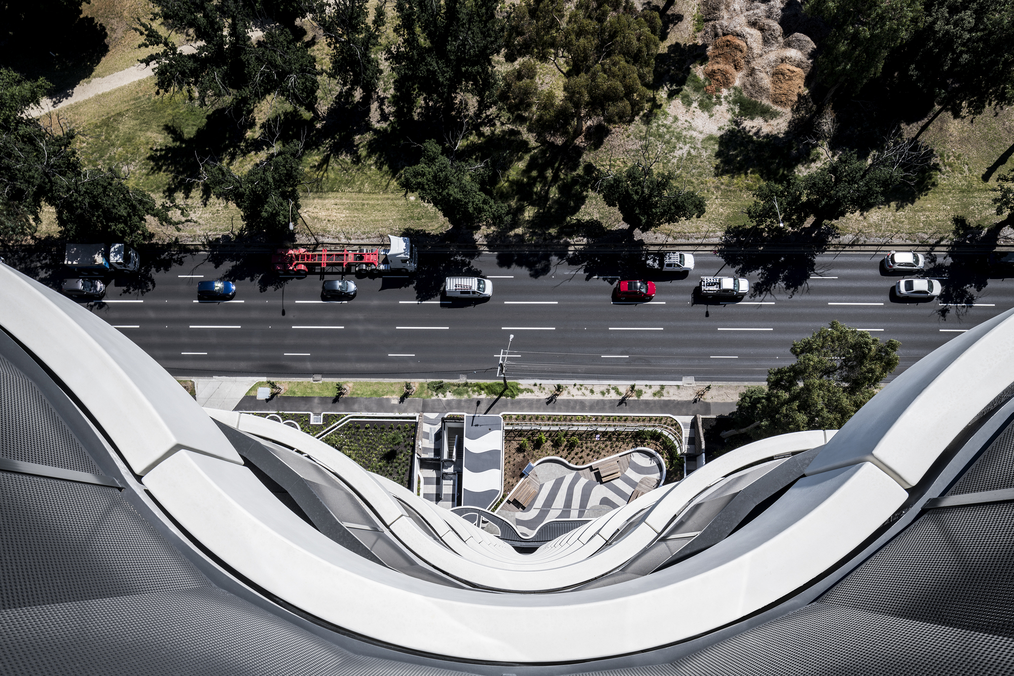 The setback from Queens Road allows for the creation of a front yard for residents to enjoy. The apartments feature deep balconies and the curved form of the tower provides shading, particularly on the west. The roof deck includes barbeque areas enclosed within a tall glazed balustrade. This provides breathtaking panoramic views while ensuring protection against wind. As a prominent part of the urban fabric of Queens Road, Queens Domain respects the established setbacks and contours of the skyline defining the area. The outline of the building has been softened by using materials with a range of textures and degrees of transparency, as well as curved balcony and façade elements. Queens Domain is a building that balances sculpture and structure. It has a contemporary design, yet it’s respectful of its surrounds and place in history. Its elegant form will add to the Queens Road precinct and stand as an important part of Melbourne’s architectural story.