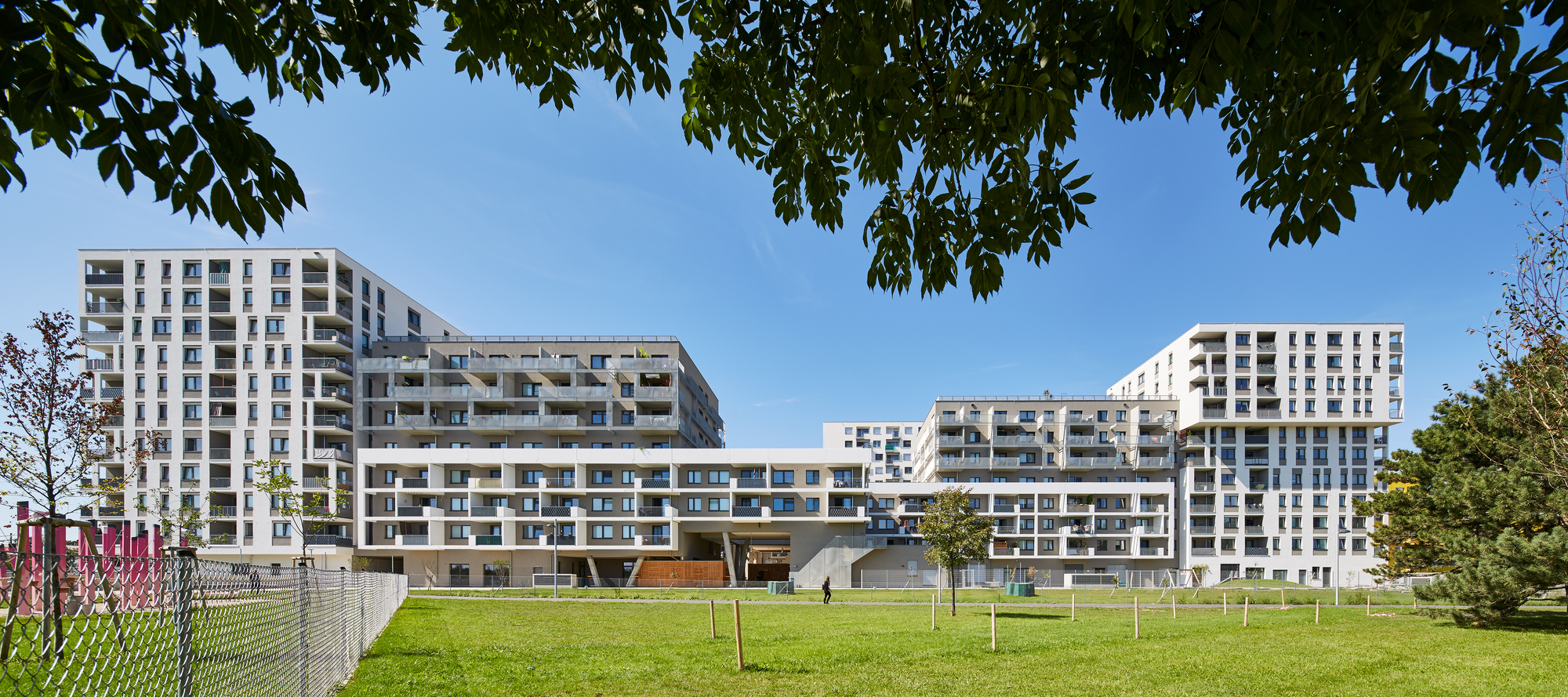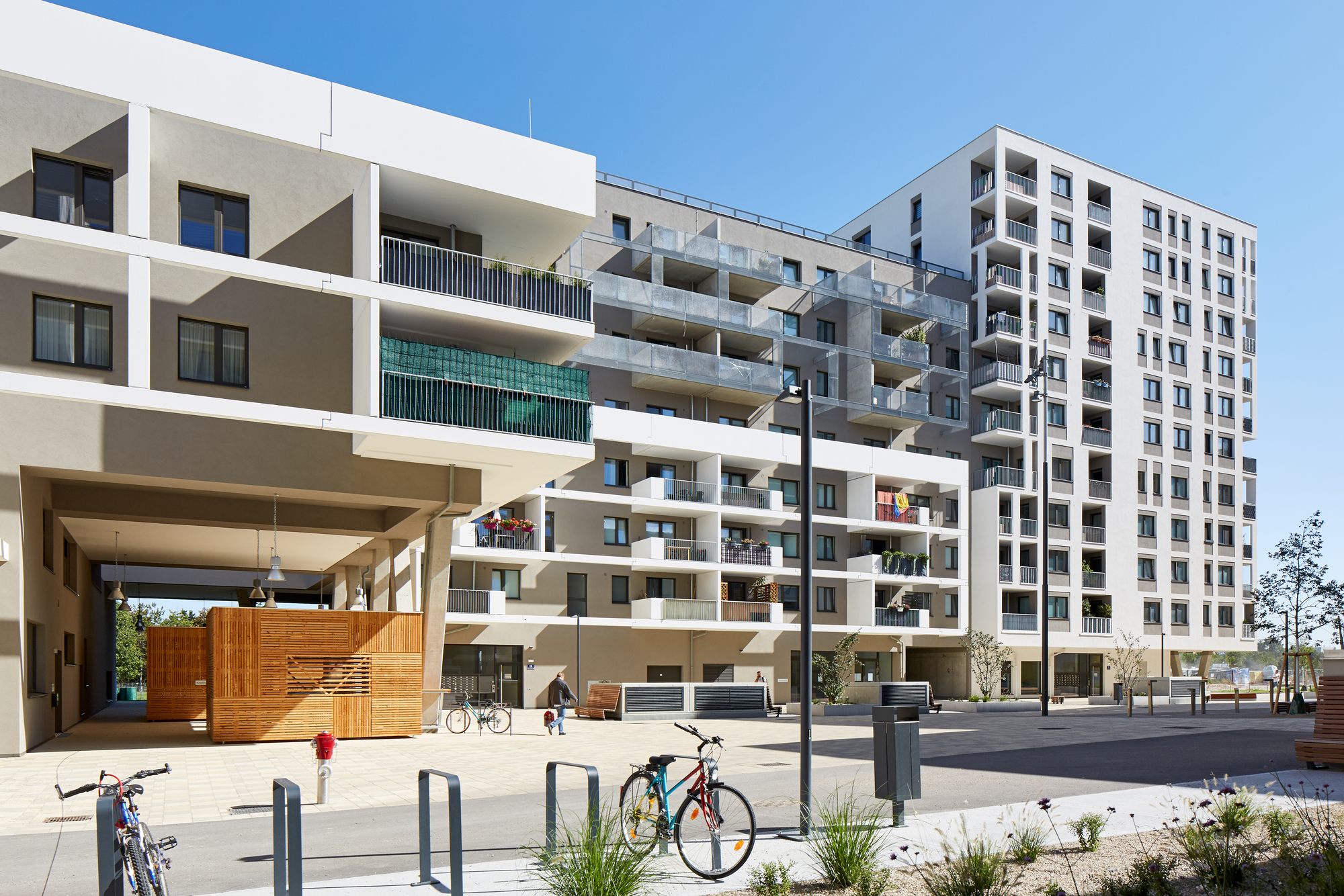 Querbeet Social Housing, Embedded between the striking residential towers of Harry Glück in the west and a functional housing complex in the east, the urbanistic guiding idea “In der Wiesen Ost” takes on a mediating position between two very different approaches of the creation of living space, structurally as well as in terms of content.