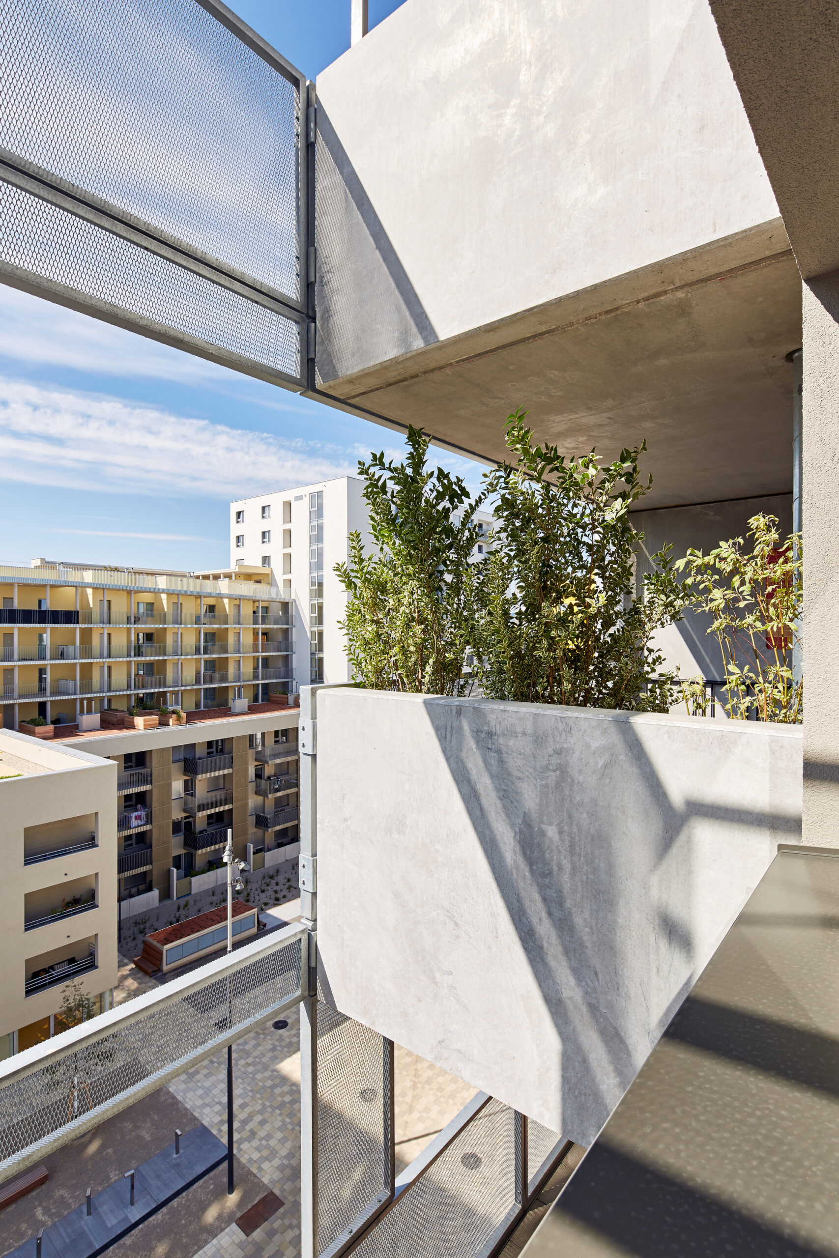 The structure of the building is reflected in the different facade solutions: The tower is designed with loggias, most of which are located at the corners of the building. Balconies with a raised side wall allow orientation to the southwest or southeast. Between individual balconies, slim concrete elements are suspended to create a second, “shelf-like” façade as a filter layer to the public space. The balconies of the “greenbox” lie behind a metal mesh as a climbing aid for the plants. The balconies are connected by horizontal elements to emphasize the privacy of the balcony zone. Both loggias and balconies offer space for plant troughs, which are provided in cooperation with GreenLab.