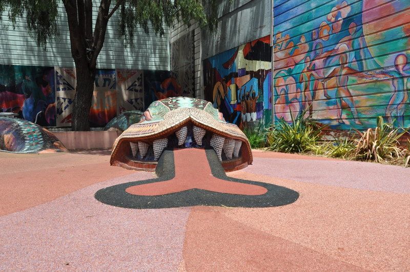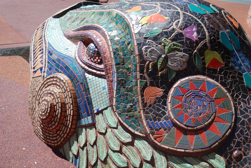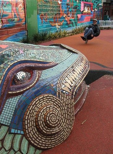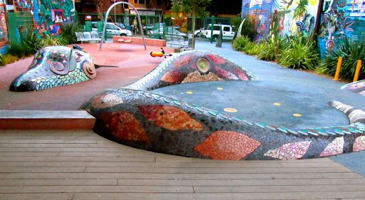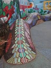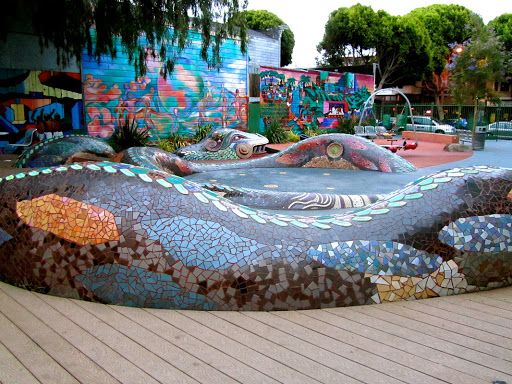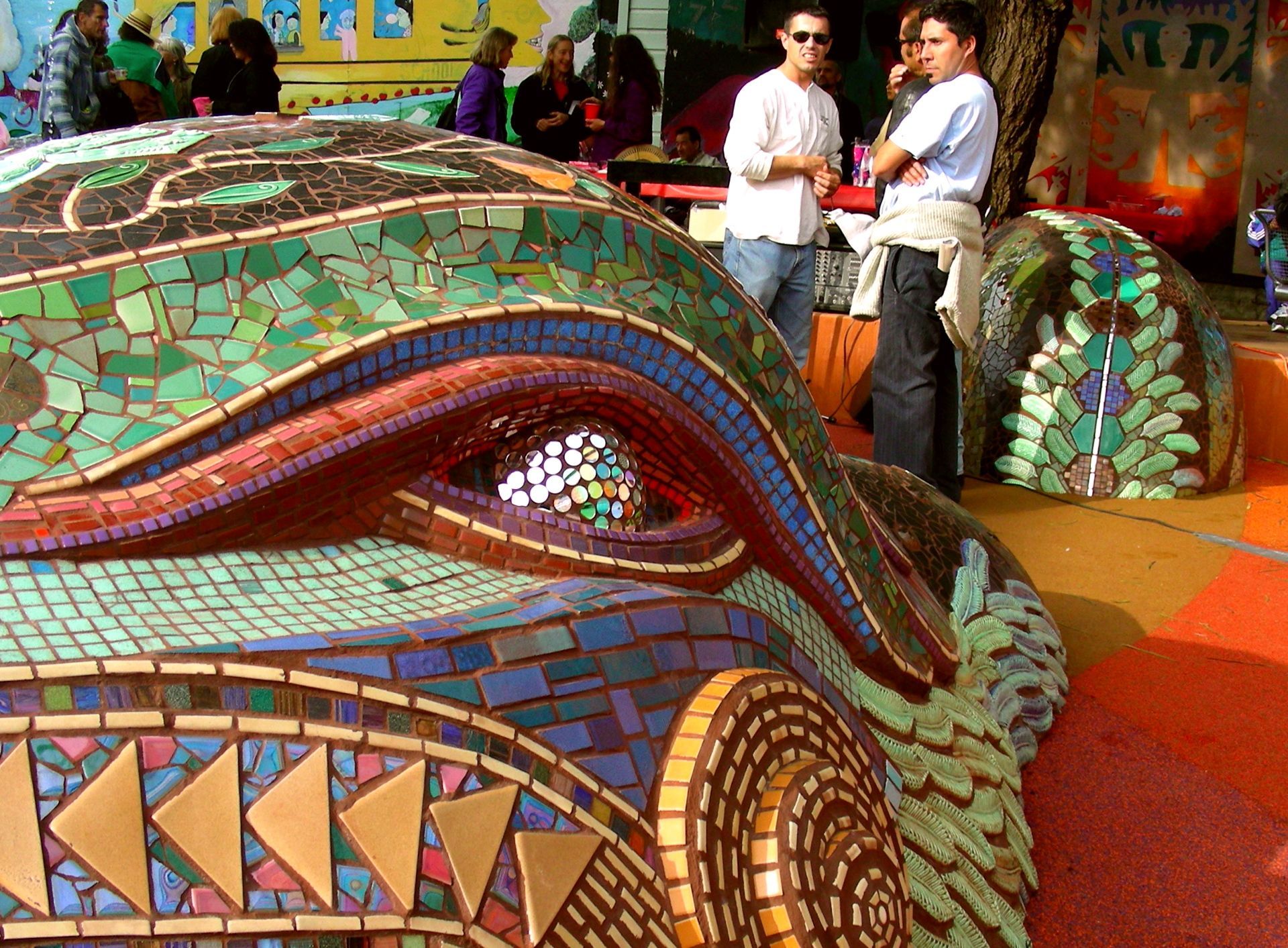 Quetzalcoatl, the serpent god of Mesoamerica, is represnted in mosaic-clad cement at 24th St. Minipark in San Francisco, CA. THe handmade tile and mosaic ornamentation was designed and fabricated by Mark Roller, Colette Crutcher and Aileen Barr. The playground, including a water feature at the center of the serpent’s spiral, was designed by architect Martha Ketterer.