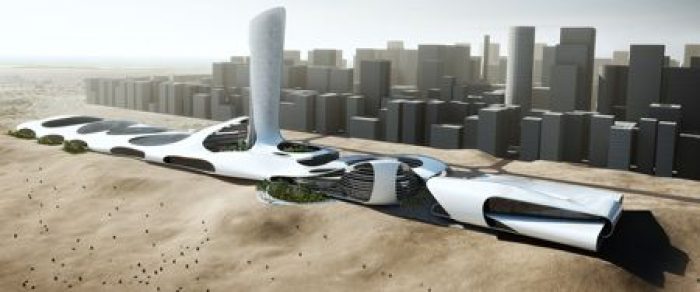 The complex’s fluid geometry is inspired by the surrounding landscape which is predominantly desert, featuring sweeping dunes and mountain landscapes. Within the form, the complex’s multiple programs weave around each other, in and through a variety of naturally shaded spaces. These intimate, protected spaces move through the undulating architecture of the development until culminating in a 200 m tall tower which will be home to a 5-star hotel with far-reaching views of the surrounding desert, gulf, and the nearby mountains.