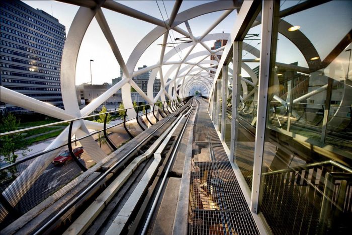 The viaduct stretches a distance of 400 meters, with a skeleton like structure from rings of mild-steel strips of 10 meters in diameter. These rings are interconnected using diagonal tubes to form an open tube structure. The structural height of the tubes makes it possible to overcome such large spans. V-shaped columns support the space-frame structure; the distance of the column is wide enough to allow two tracks for passing trains. Due to the large spans that this tubular structure can reach, around 40 to 50 meters, this means less supporting columns are needed, reducing the amount of visual obstructions at street level.
