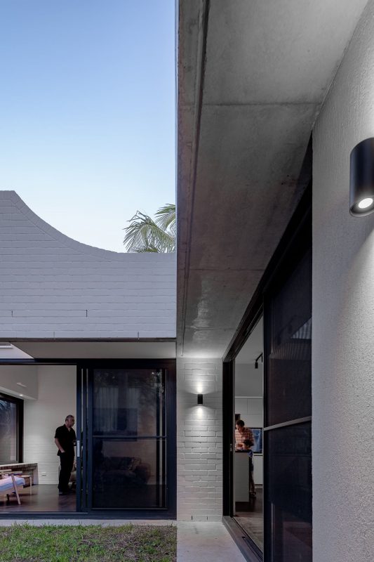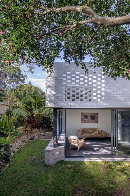 Randwick Pavilion designed by MASQ architecture, Our inspiration for the project lay in the established backyard which sat sunken down slightly from the surrounding. The brief was to add a new living room space, kitchen and accompanying dining room. We particularly wanted to have the living room feel very much like a pavilion in the garden, however, we saw this as an enclosed and protected space as much as it needed to be connected to the garden. We created a brick wall that enveloped the upper level which was then suspended above glass doors and windows below.