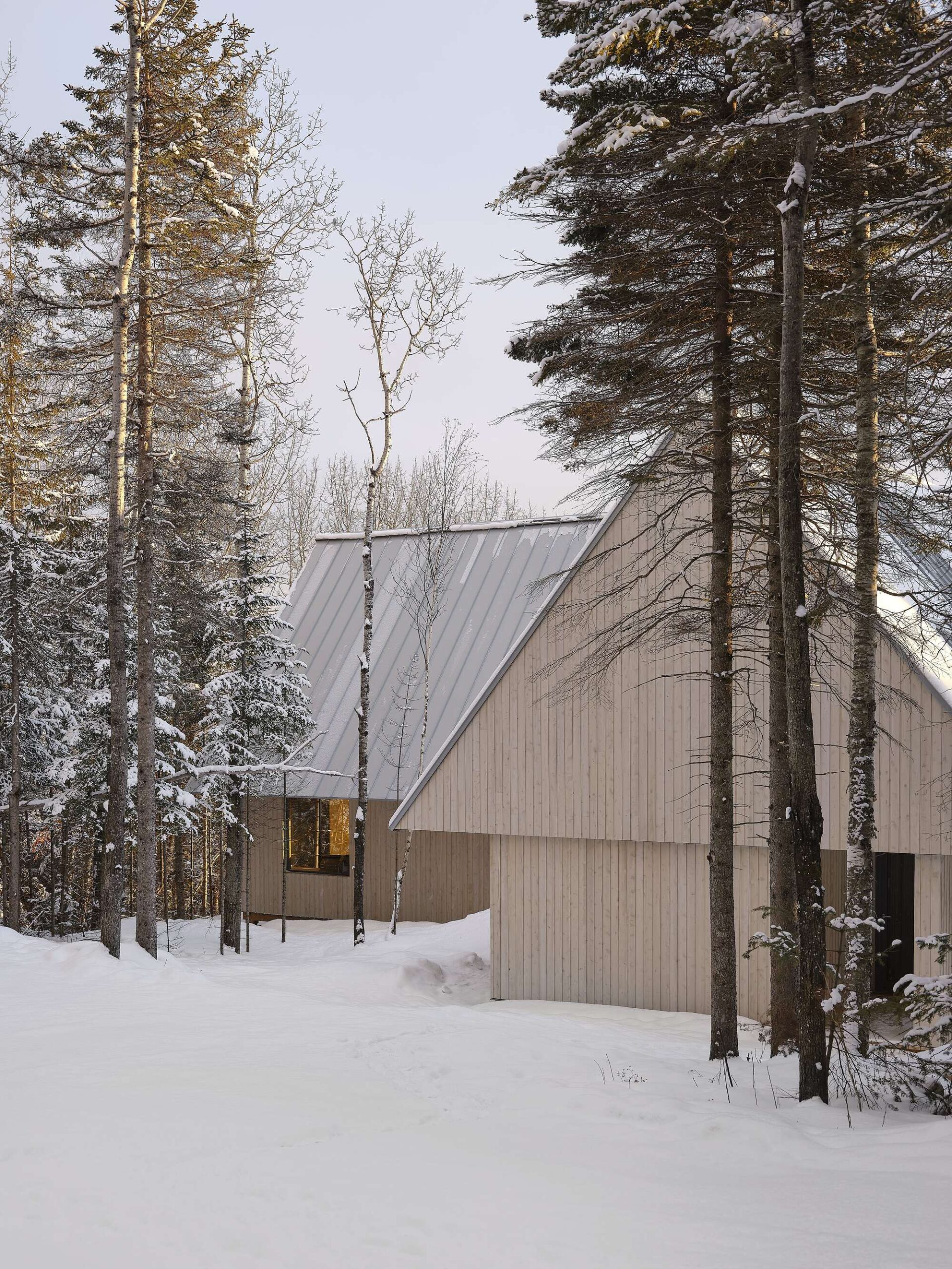 This former woodlot is interspersed with trails that were once used for logging and have now been converted into cross-country ski paths. The owners wished to create a cherished place for friendship, activities, and rest, capable of hosting up to twenty people under one roof, so that it could become a point of convergence for the entire family and future generations.