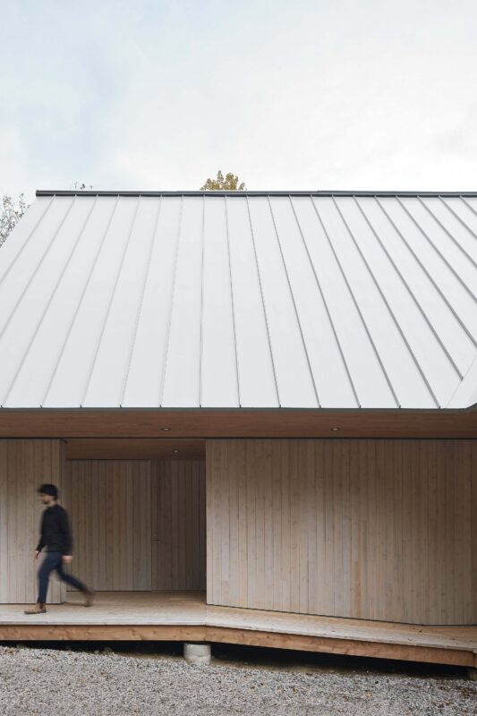 The project is situated at the edge of the forest, opening up to the panoramic view. Two volumes intersect to form a T-shape, generating three wings: the entrance wing, the living wing, and the sleeping wing. Each one stretches out in a different direction to capture distinct fragments of the surrounding landscape.