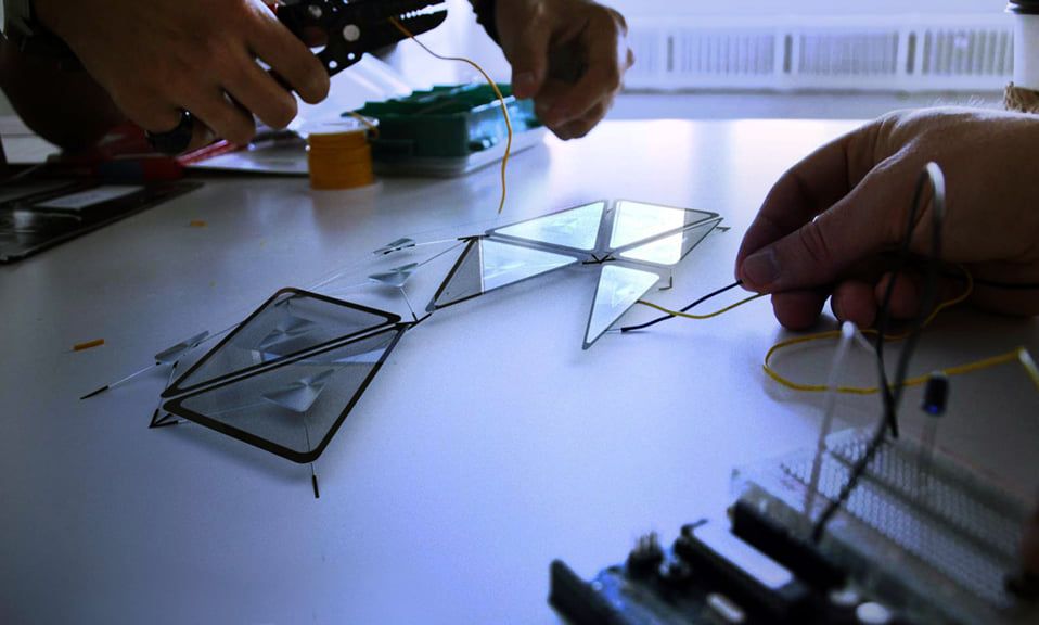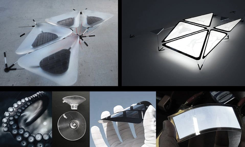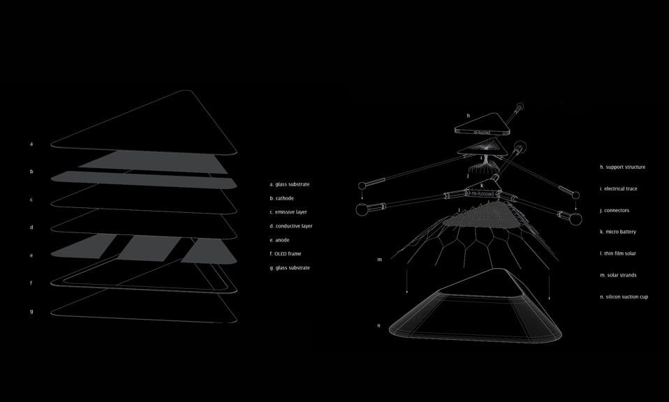 1. During the day, stick the closed lamp to any window. Thin film solar sheets embedded in the silicone suction cups will charge an array of microbatteries. Boost converters allow voltage to be stepped up, or amplified, to power the OLED lighting elements.
