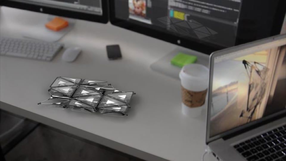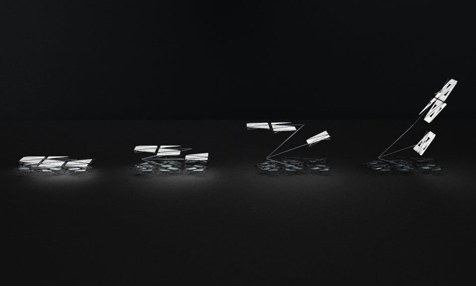 3. Press anywhere on the OLED array and the light transforms into its discharge pose. An armature actuated by spring loaded and gas struts unfurls, while the boost converters are switched on and activate the light itself. An embedded photometric light sensor monitors the ambient light conditions, and adjusts the light output accordingly to preserve battery life, and provide the most balanced and pleasing light quality.