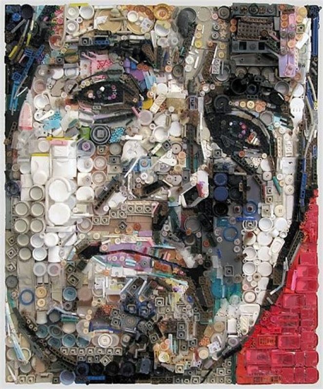 Since 1999, the artist Zac Freeman gets what he finds and then turns it into a true work of art, be transforming consuming garbage into portraits that can be seen that distance! There’s something so intriguing about finding the domino, altoids tins, bride & groom cutouts, and dolls in the self-portrait below, and then pulling back to focus on the intense gaze. These striking images create a kind of optical illusion reminiscent of Chuck Close, where it’s almost impossible to focus on the face and the objects at the same time.