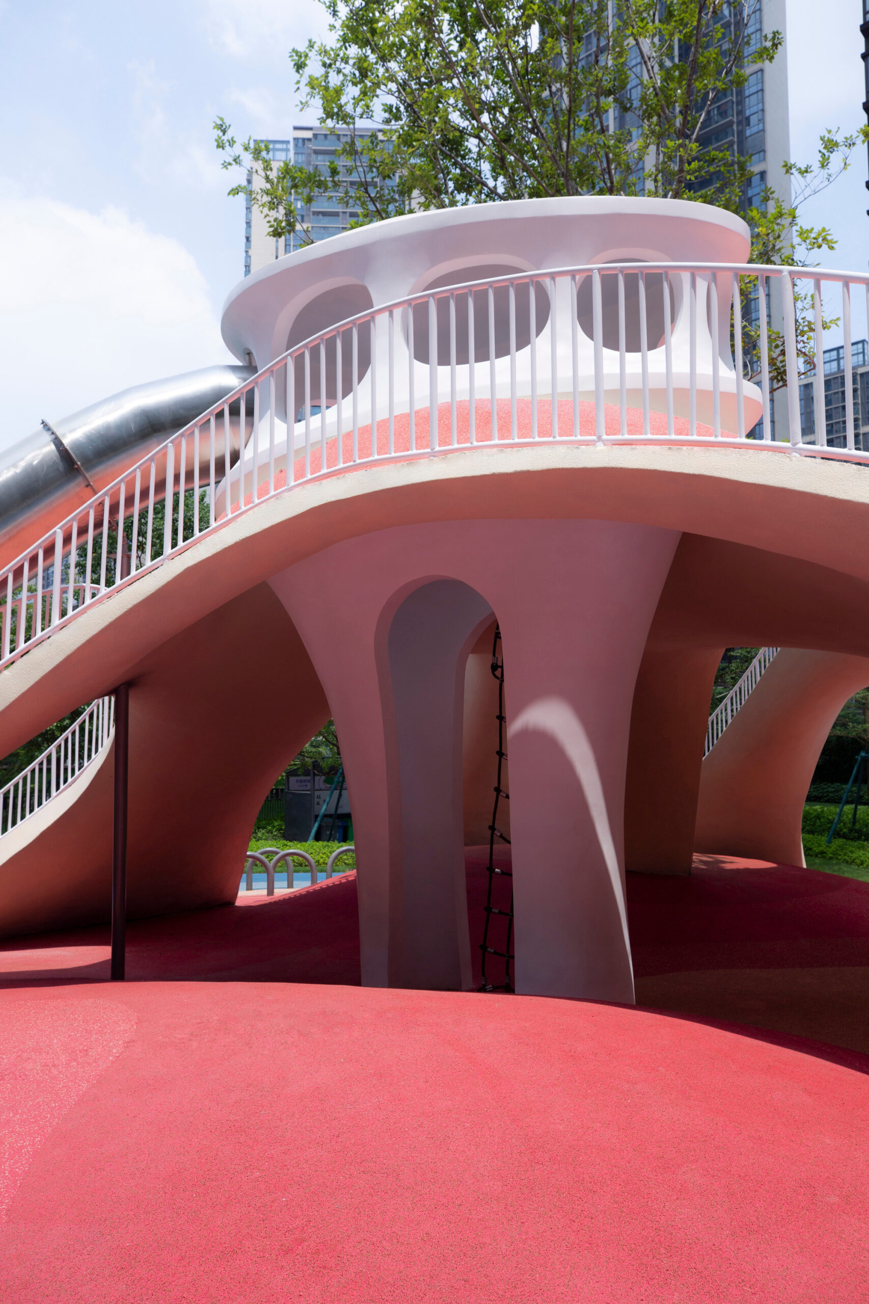 The undulating red dunes provide a space for children to run, jump, and roll while integrating a variety of functional children’s activity installations into the terrain. With its innovative design techniques and advanced technologies, such as parameterized topography design, digital calculation of natural drainage, and the use of a unique concrete shell structure, the project harmoniously blends functionality, aesthetics, and sustainability. It aims to inspire users of all ages to embrace outdoor play and exploration while fostering a strong connection with the surrounding natural elements.