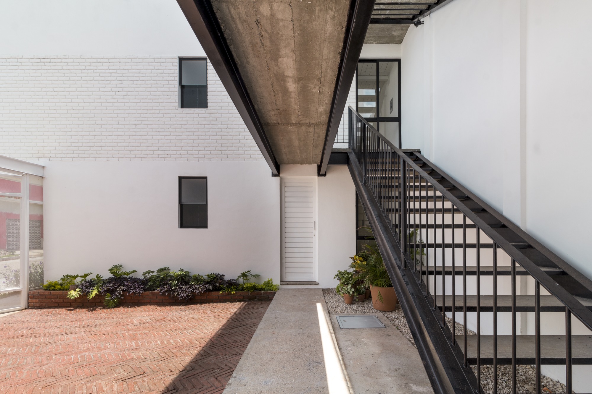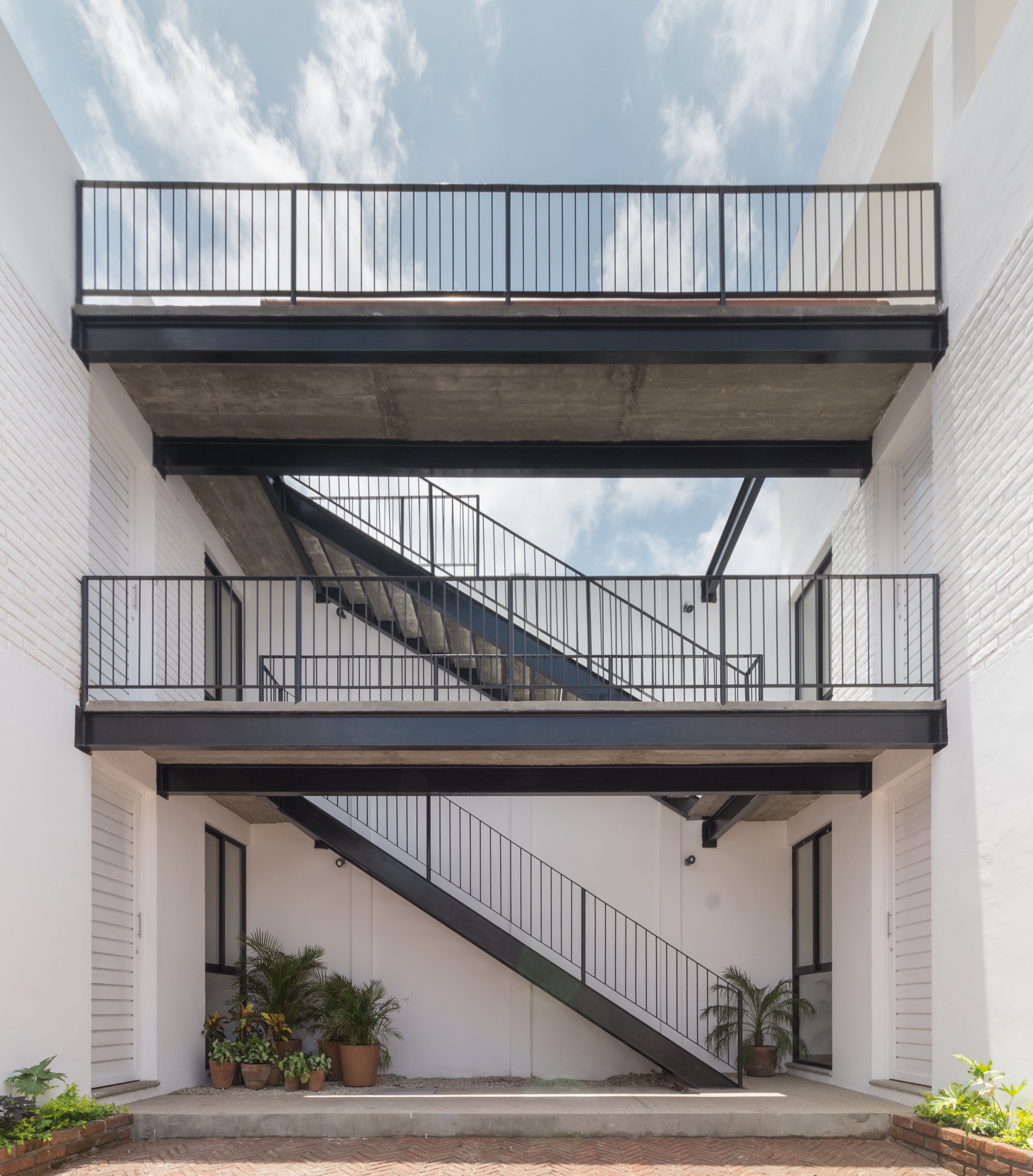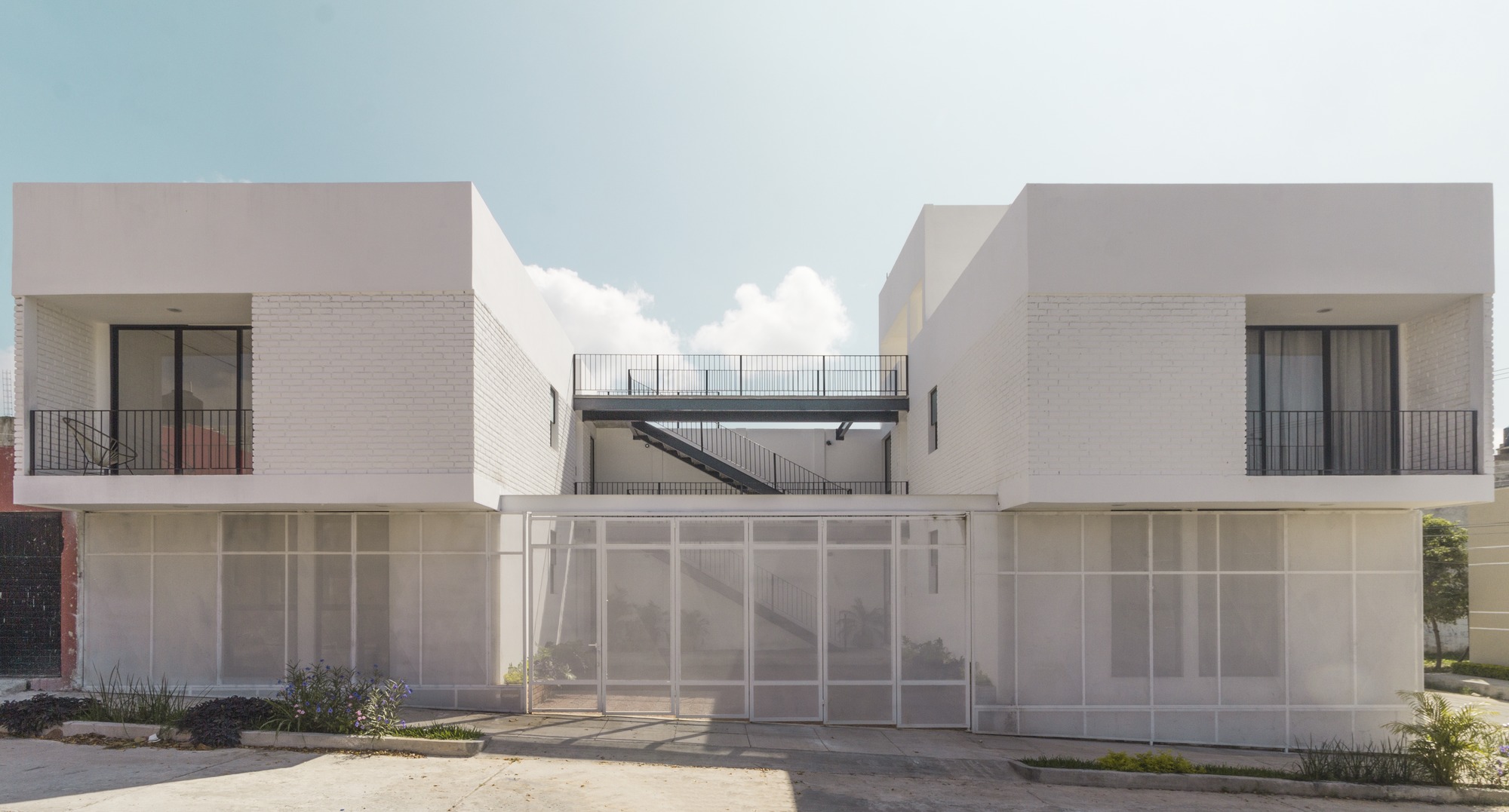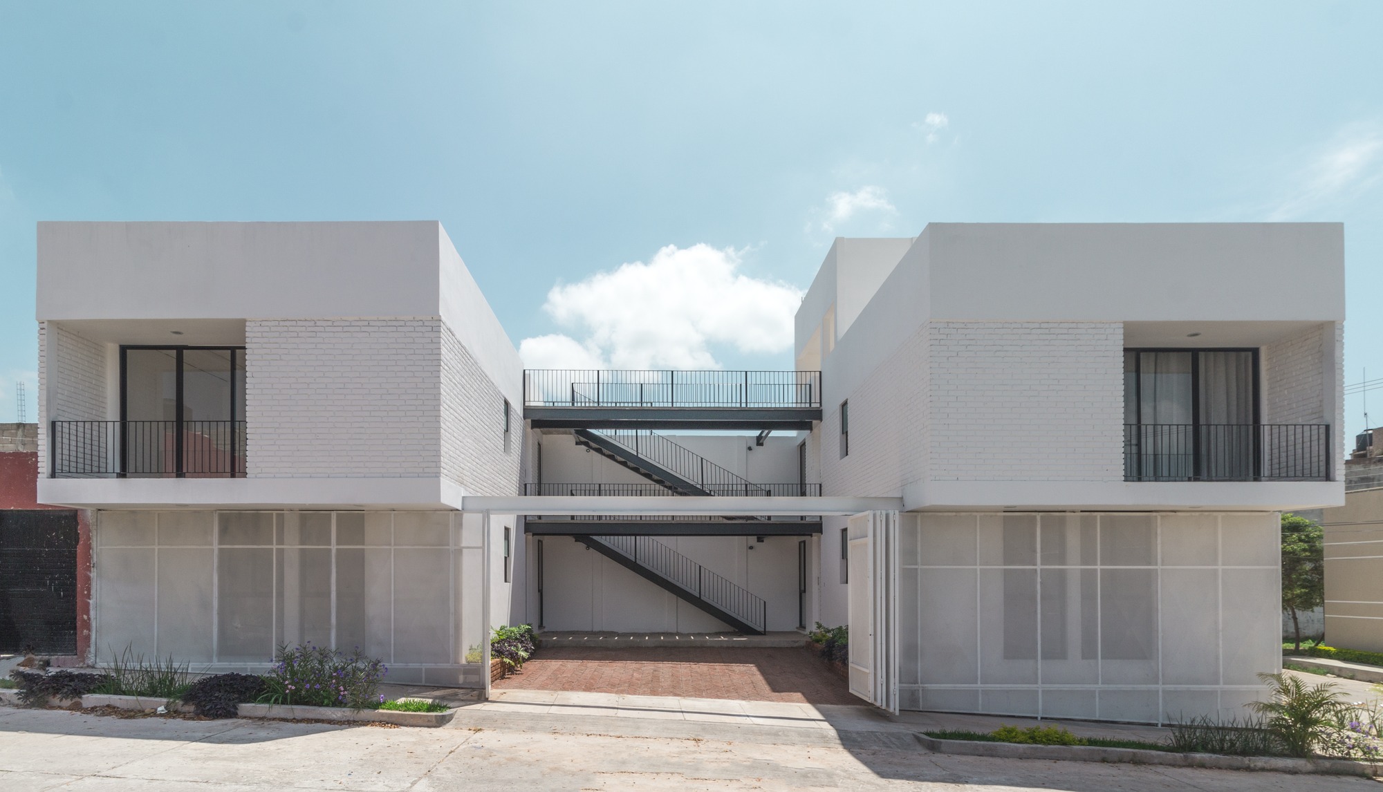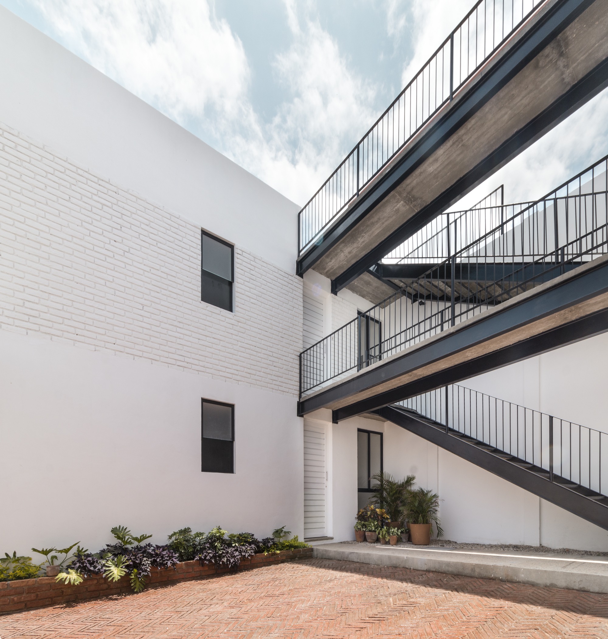 The construction materials are revealed in the materiality of the complex and only by the means of light and shadow, an almost ethereal white defines the sobriety of the volumes. It is the light that defines the reality of the textures, such as brick in the walls and the slabs and the supporting steel of the interstices. Each department allows the clear passage of wind and natural light since within the complex, a light cube was proposed, housing vegetation and cleansing each compartment.