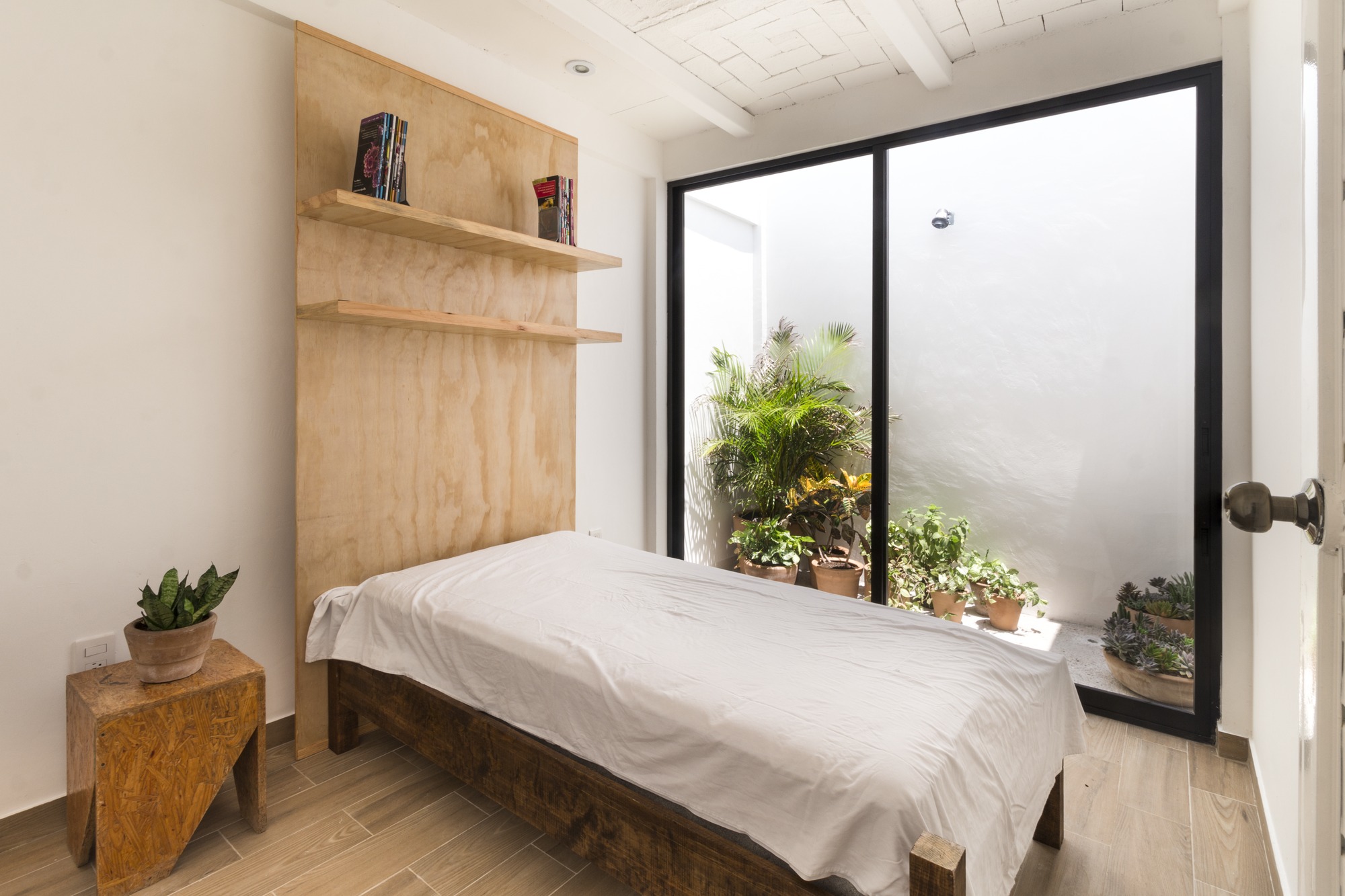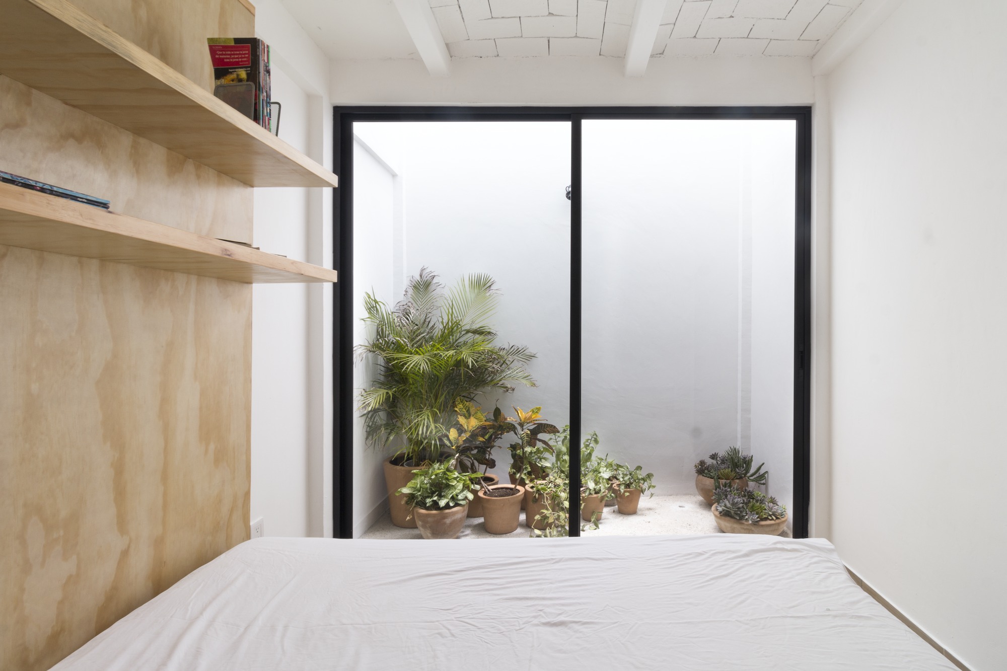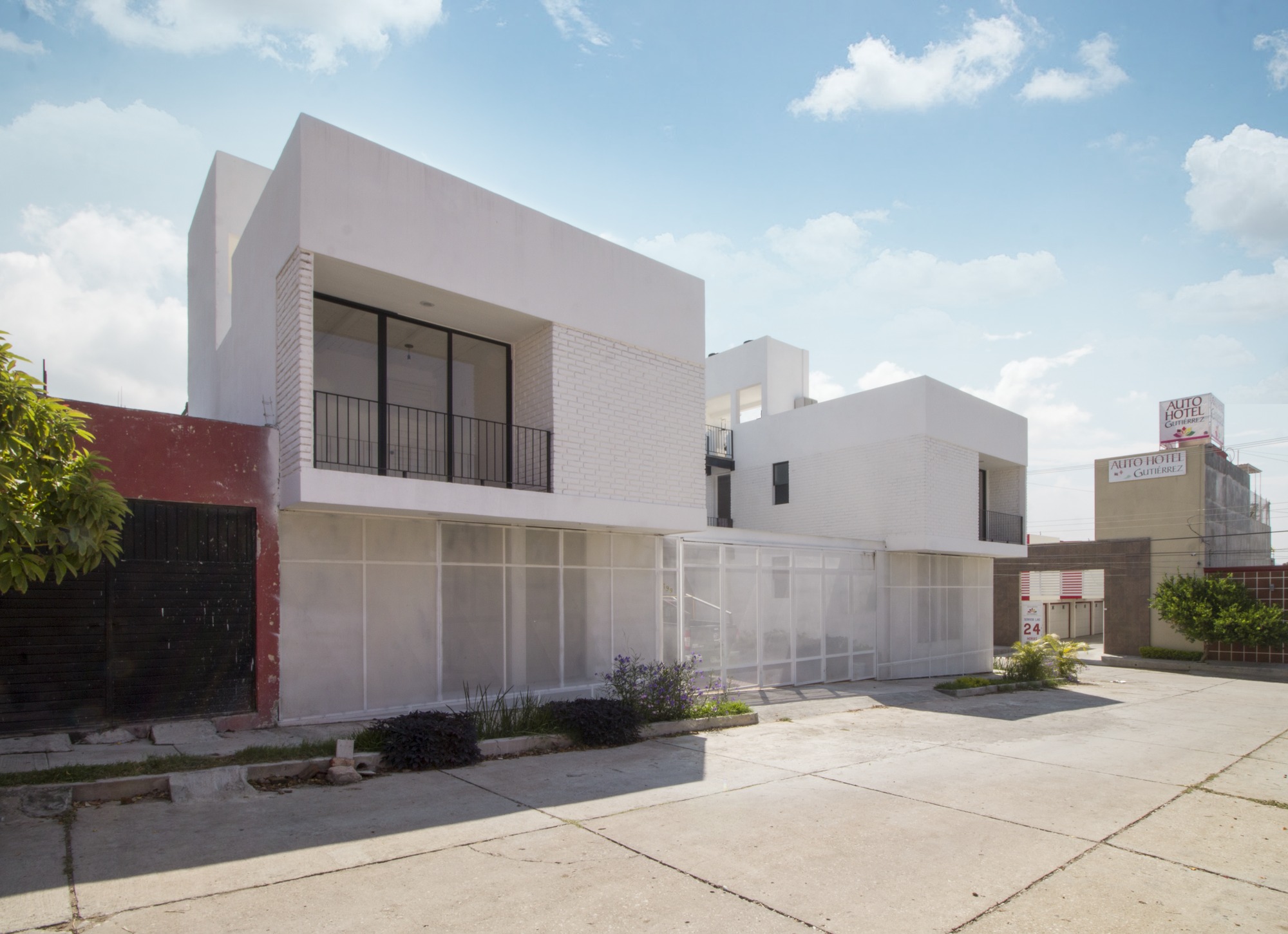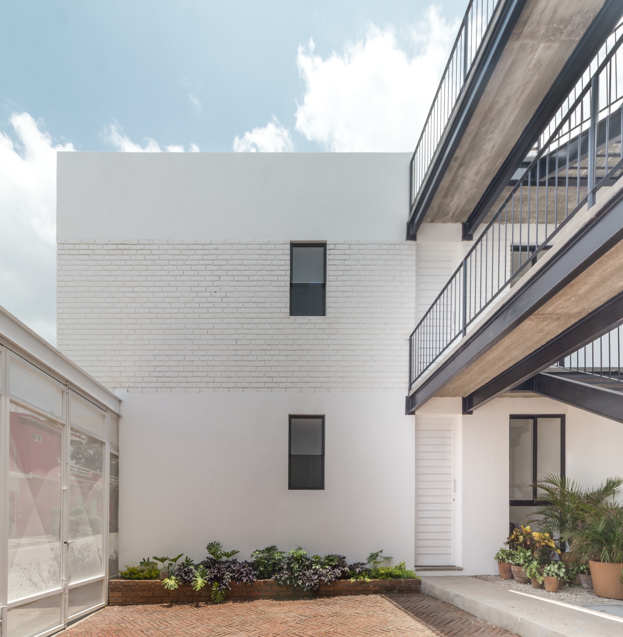 The construction materials are revealed in the materiality of the complex and only by the means of light and shadow, an almost ethereal white defines the sobriety of the volumes. It is the light that defines the reality of the textures, such as brick in the walls and the slabs and the supporting steel of the interstices. Each department allows the clear passage of wind and natural light since within the complex, a light cube was proposed, housing vegetation and cleansing each compartment.