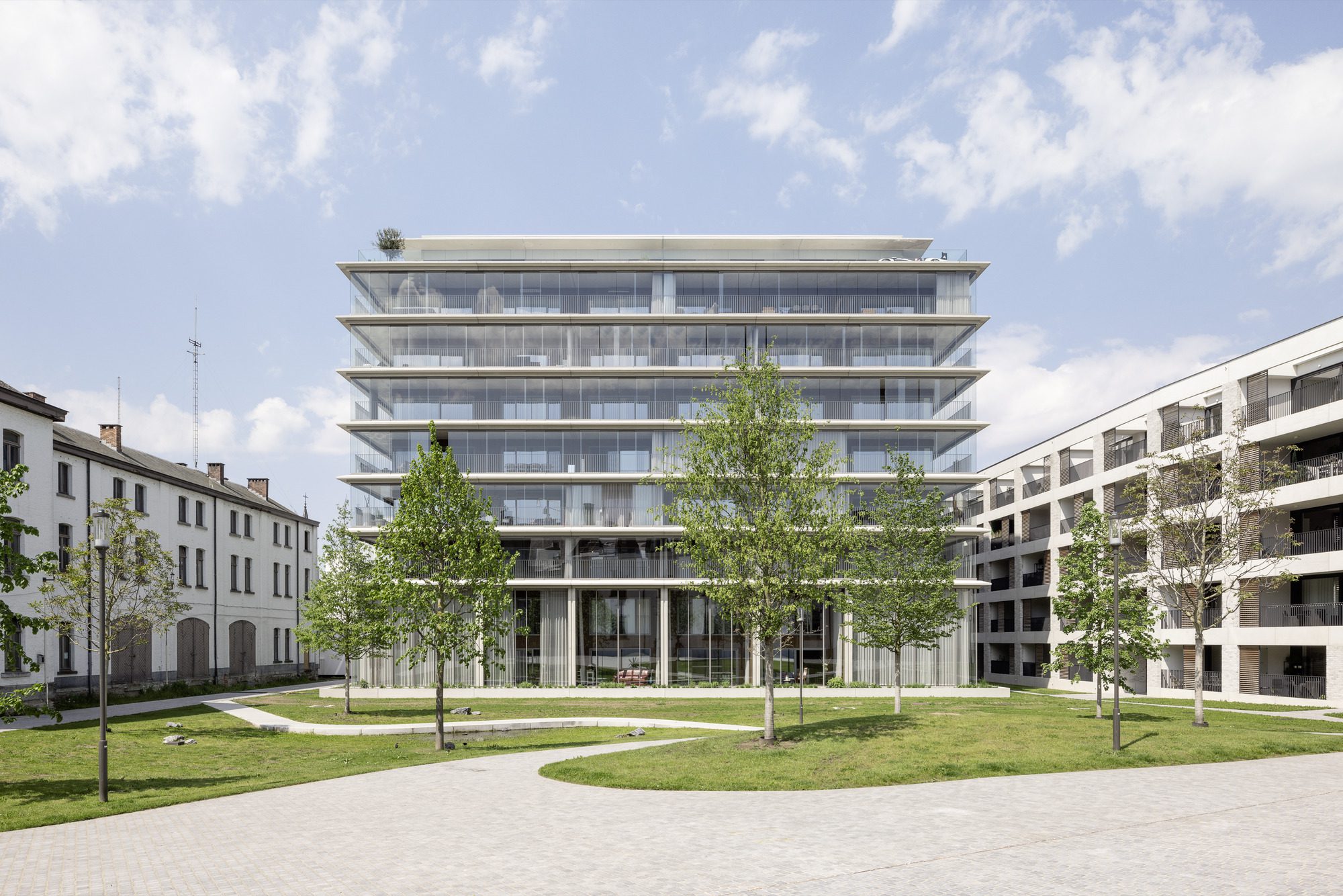 High-Rise Building inside the Block. To add to the supply of housing required in a strategic manner and achieve a sensible utilization of the plot of land, the realization of a nine-story residential building in the green interior of the block was also proposed. This raised the question of the form that this architecture, which is untypical for the existing historical context in Europe, should take. Atelier Kempe Thill thus proposed a winter garden building that is quite transparent toward all sides. On the one hand, this strives for a matter-of-fact-seeming contrast to the stone and rather heavy brick architecture of the block perimeters in order to emphasize the break with history and underscore the spatial distinctiveness of the park. On the other, an attempt was made to design the building in a rather reserved manner so that it does not dominate the overall situation and the ensemble effect of the block is emphasized. At the same time, attempts were made to relativize the large and tall building mass by means of an open and very airy design and to generate a certain lightness by means of the rather informal character of the façades. The architecture thus makes maximum reference to the green park landscape, the existing historical façades, and the impressive panorama of the city center of Hasselt with its emphasized horizontal, modernistic structure and the strongly cantilevered open building corners. Beneath the residential building, there is also a two-story underground garage. Consequently, there was no need to construct a cellar under a large portion of the park, which means that the newly planted trees have sufficient space to be able to develop well.