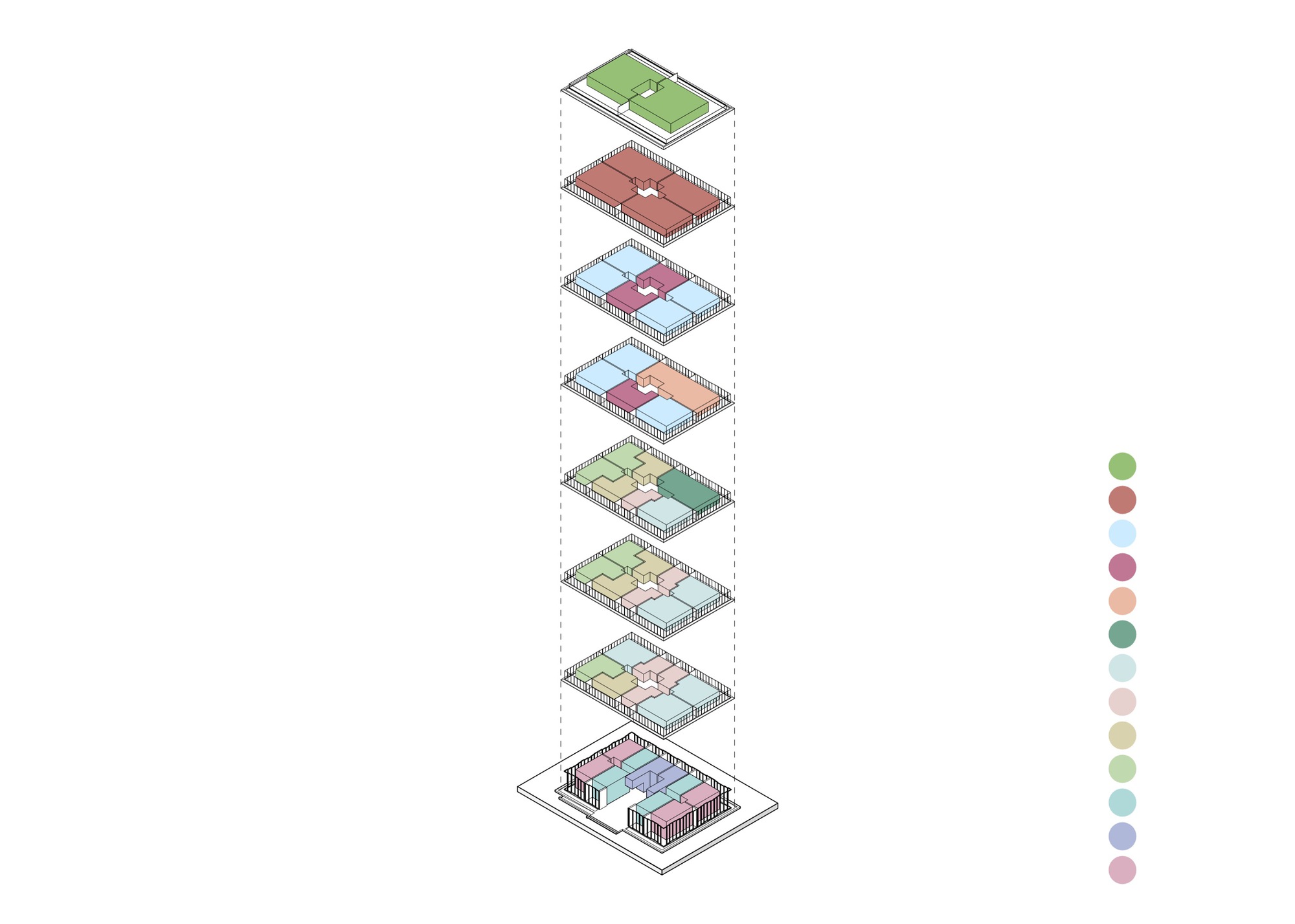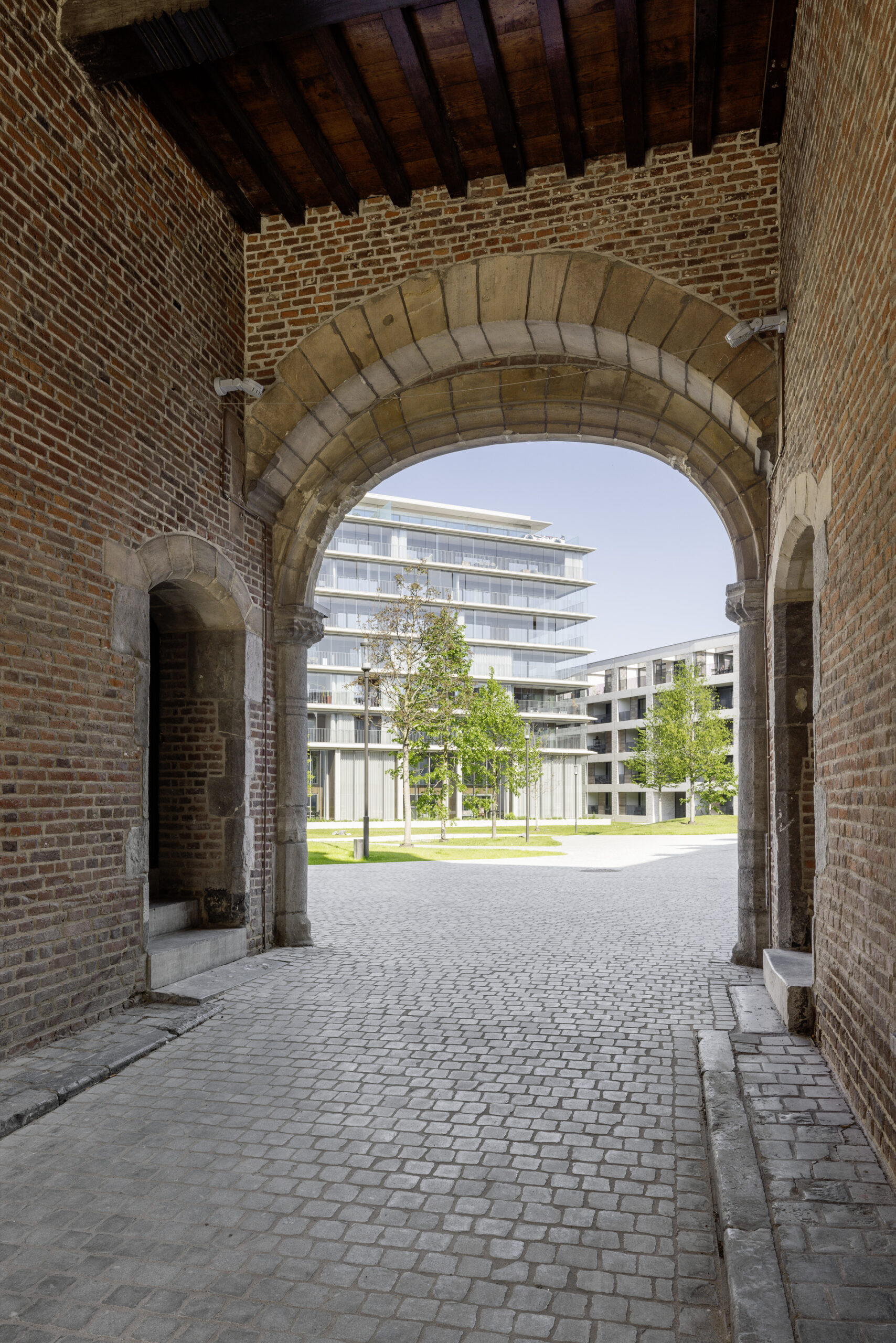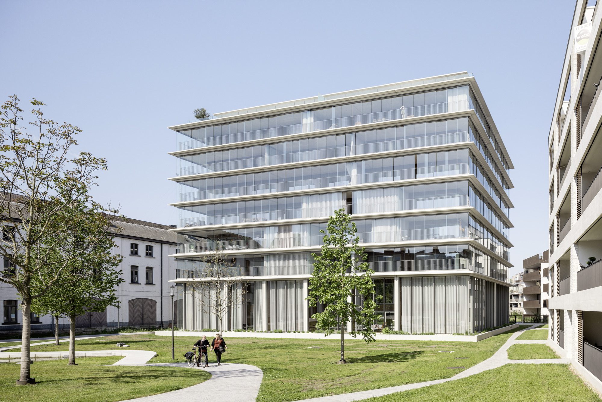 Refuga Wintergarden Tower , Transformation of the Herkenrode Barracks. In 2015, the planning team consisting of Abscis architecten, the UAU collectif, LAND landschapsarchitecten, and Atelier Kempe Thill architects and planners, in cooperation with the local property developers Kolmont and Vestio, won a competition by invitation for the development of the Herkenrode barracks in Hasselt, the capital city of the province of Limburg in the east of Flanders. The design team proposed a substantial conversion and retroactive densification of the block in the city center that adheres to the historical model of the medieval city but also supplements it with new spatial, social, and ecological qualities. What was proposed was rededicating the former drill grounds for the infantry soldiers in the middle of the block as a calm, green oasis in the city center. To link the new park with the public urban space as optimally as possible, three new passageways were thus integrated into the existing block and oriented the block perimeter development more intensively toward the greened courtyard space. The existing refugium of the “Sisters of Herkenrode Abbey” from the Renaissance (1544) as well as several monumental barracks buildings from the late nineteenth century are therefore embedded quite carefully in the new park concept and have been converted in part into residential buildings. One section of the northern block perimeter development from the twentieth century was demolished due to building damage and replaced with contemporary residential buildings, under which there is a two-story underground garage for the necessary parking spaces. With its cubic volume and its light brick façades, the new architecture is oriented toward the surrounding development and opens up to the green interior of the block with its spacious balconies and inserted entrance halls. These buildings were designed by Abscis and the UAU collectif.