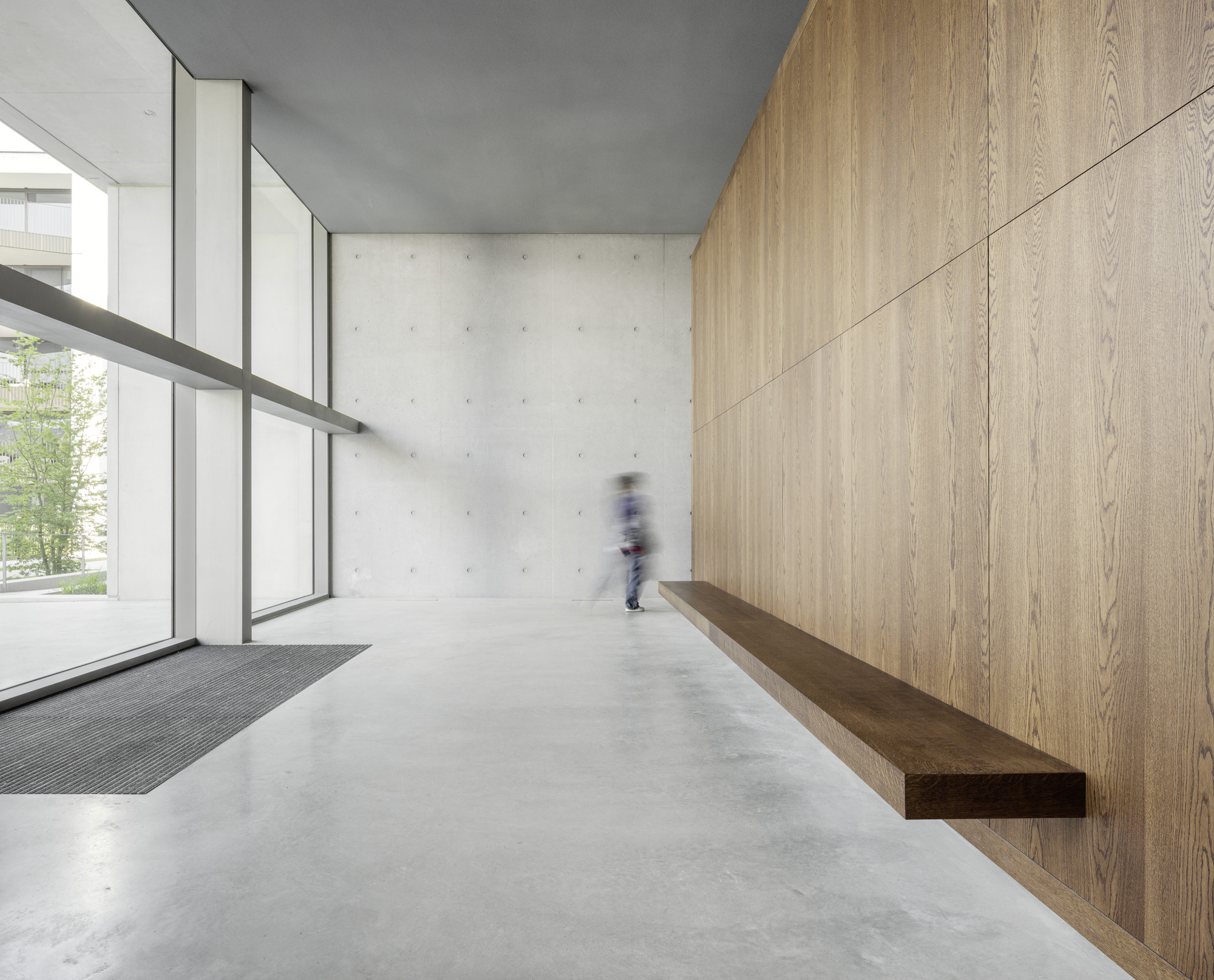 Economy, Permanence, and Sustainability. The project strives for an as self-evident as possible combination of ambitions that are frequently perceived as contradictory—economy, comfort, sustainability, flexibility, and permanence. As a result of its great compactness with a limited façade surface and the very efficient central passage access, the building is both very economical and nearly optimal in terms of energy efficiency. The project also makes a vital contribution to the necessary ecological retroactive densification of urban centers. The winter gardens contribute significantly to creating a very relaxed living atmosphere and considerably improve the residents’ quality of life. At the same time, they serve as fixed protection against the sun in the summer and as an energy buffer zone in the winter period. The building is accessed via a spacious, double-height hall on the western side. With its exposed concrete, polished concrete floor, and a freestanding oakwood wall, it celebrates the collectivity of housing and underscores the urbanistic grandeur of the project. The basic structure of the building was realized with a combination of in-site concrete and prefabricated elements. With its great flexibility and future-oriented convertibility, this structural basis strives for a very long lifespan and was thus designed in a particularly robust and resilient manner. The interior construction was executed with flexible lime sandstone elements and lightweight construction. The façades, indoor floors, and terrace floors were realized with various types of wood, thus giving the apartments a rather suburban and warm atmosphere. The windows and sliding elements of the winter gardens are made of aluminum or steel and are up to 5.70 meters high on the ground floor. From the perspective of the architects, the building is a nearly perfect balancing act in line with Leon Battista Alberti, since it attempts to achieve architectural sustainability, particularly by means of the structure’s openness to various uses, sensible compactness, the robustness of the materials selected, and the beauty of the spaces.