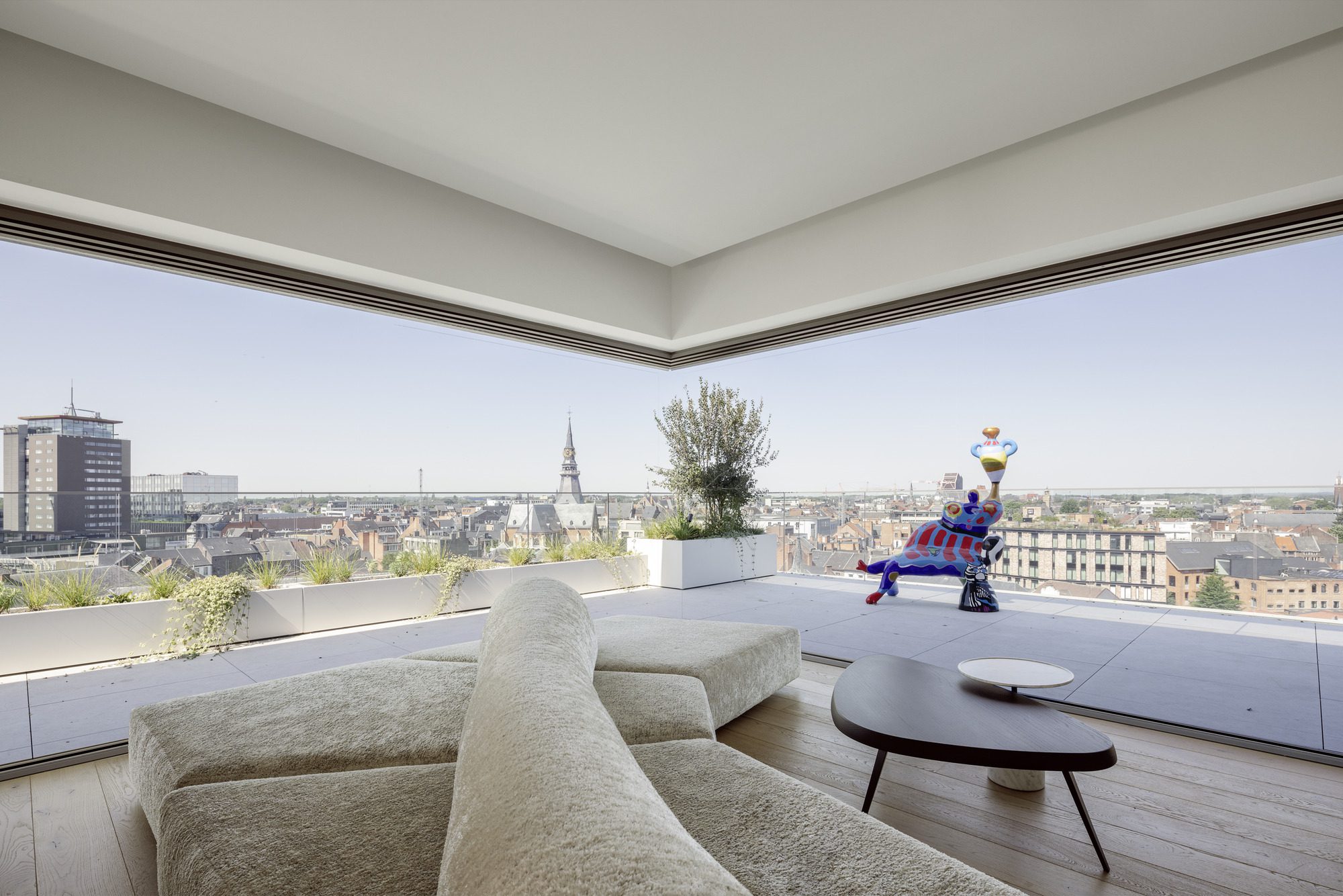 Starting on the second floor, one-story apartments are offered. The interior façades are glazed as generously as possible and equipped with large sliding elements. The windows provide a horizontal panorama of the surroundings and facilitate a reference to the protruding winter gardens that is as flowing as possible. The apartments on the lower floors are thus oriented more toward the park and the block perimeter development while starting on the fifth floor, the apartments enjoy a panorama over the roof landscape of Hasselt. Two very individual penthouses were realized on the roof of the building. They are conceived as “rooftop villas,” and each one has a rooftop terrace of roughly 175 square meters.