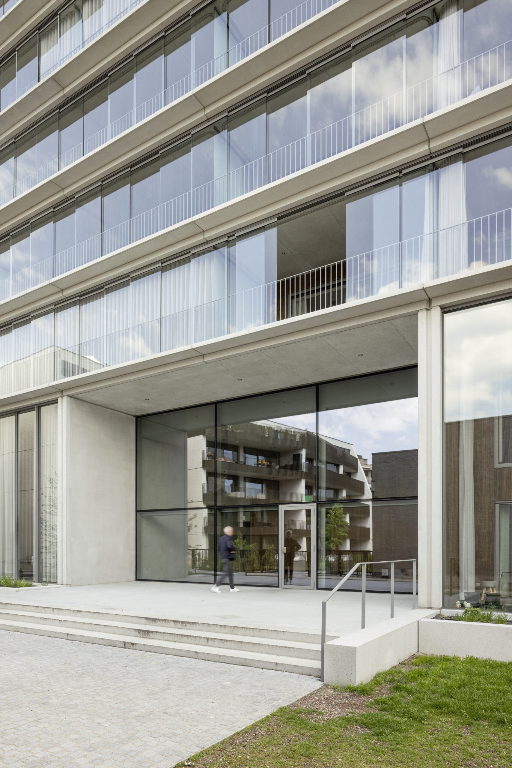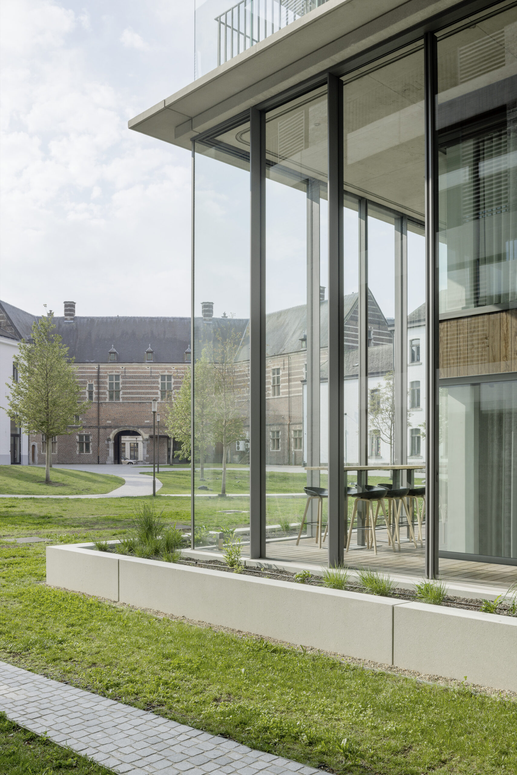Prototype and Ensemble. For Atelier Kempe Thill, the project is on the one hand a new prototype that takes inspiration in particular from experiences with the social-housing projects Hiphouse Zwolle and Montmartre Paris. What has been created here as a result of the strategic merging of urban and suburban qualities is an affordable, ideal model for urban housing beyond the notion of a social subsistence level. With its large winter gardens, flowing relationship between inside and outside, loft-like layouts, and very high-quality materialization, the project can be regarded as a real alternative to the prevailing Flemish model of residing in single-family houses. On the other hand, the project is the very specific result of the aforementioned complex strategy for converting the historical block. Due to its quite calculated spatial effect, what arises is a symbiotic relationship to the stone block perimeter development, the servicing underground garage, and the contemplative park, and the new building thus becomes part of a quite fascinating urban ensemble for Hasselt, whose culmination it forms.
