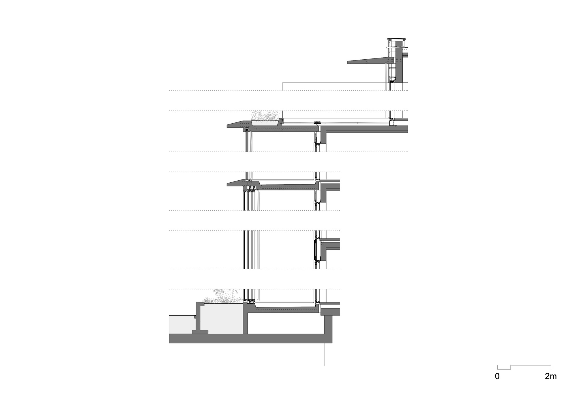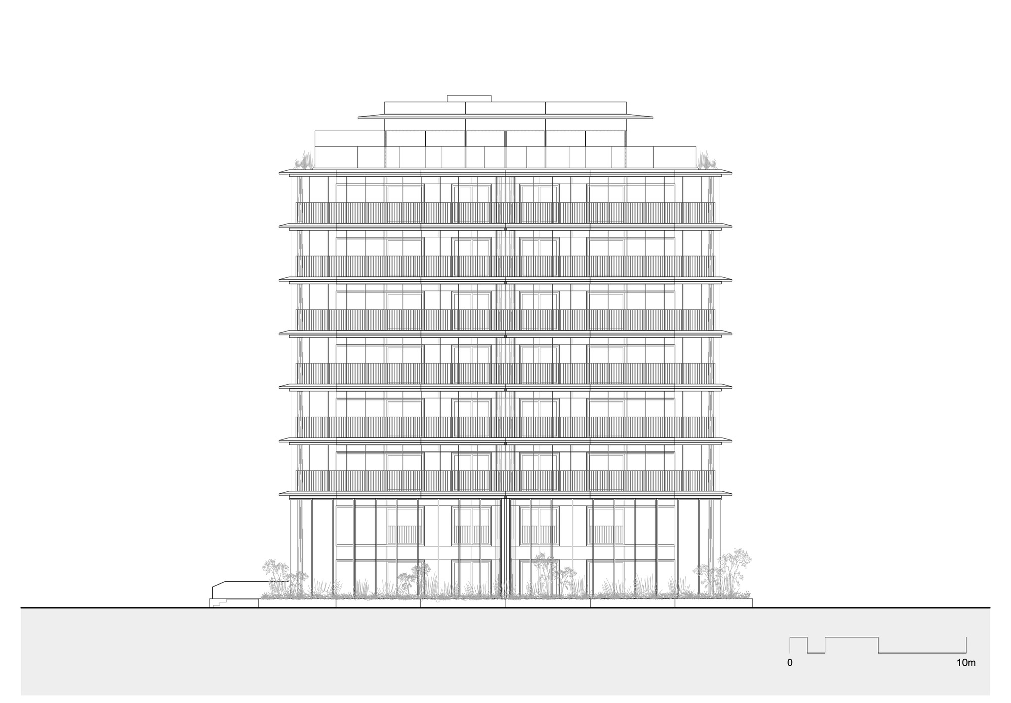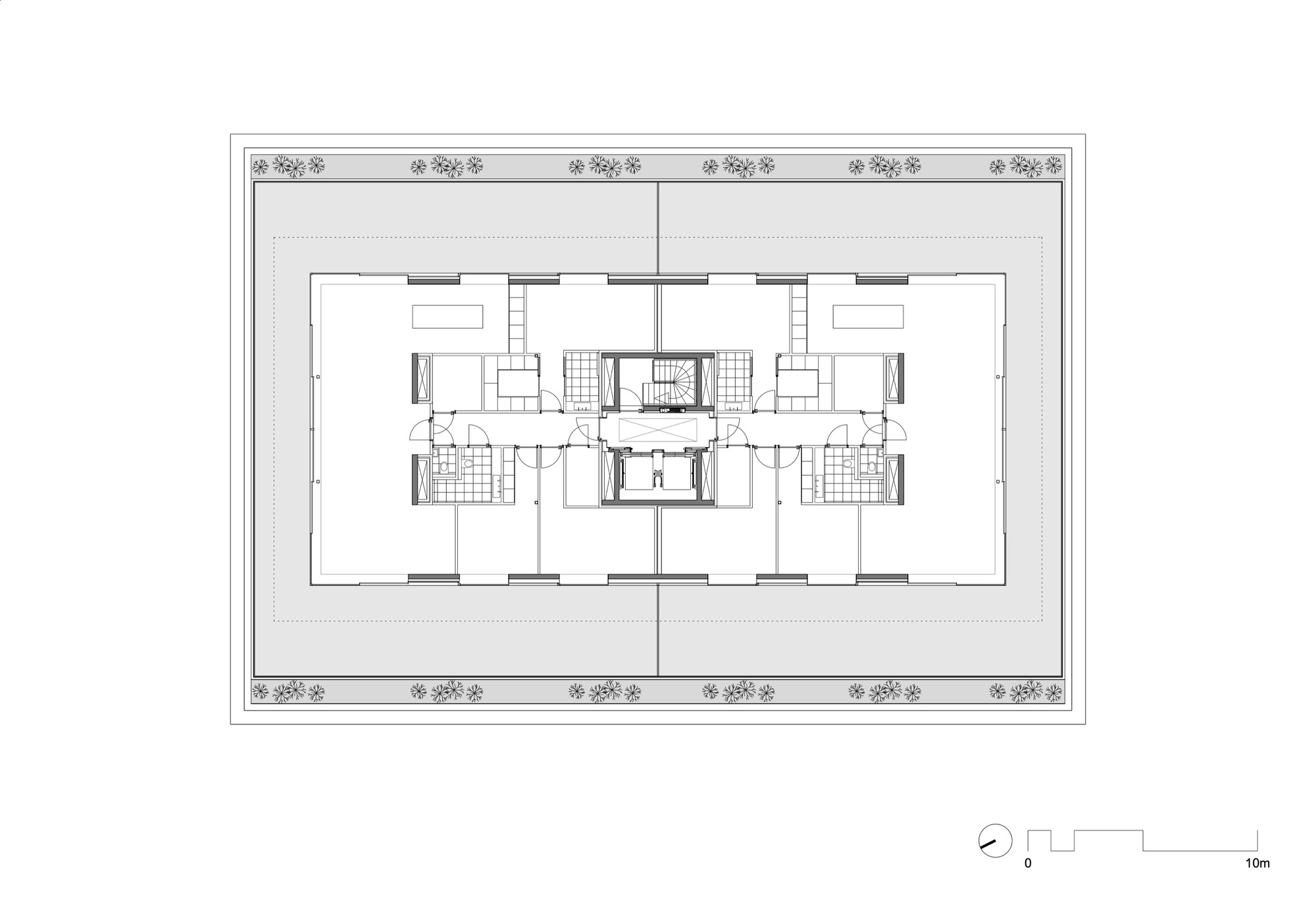 Urban Architecture with Suburban Qualities. The residential quality generated by the project is ambivalent. On the one hand, the building is situated in a very densely developed and intensively used location in the city center and the architecture and the apartments themselves have a rather urban and collective character. On the other hand, as a result of the protective flanking construction, the immediate surroundings of the building are free of cars, green, very clean, surprisingly calm, and thus seem suburban. To make optimal use of these qualities for the apartments, a vertical zoning of the project was striven for. On the first two stories, duplex units are offered in order to make it unnecessary to position bedrooms on the ground floor. To guarantee sufficient privacy and comfort for the living spaces on the ground floor as well, the building was raised roughly 0.5 meters above the actual level of the park, and the living rooms were given protruding, double-height winter gardens and circumferential, raised plant zone that is part of the park architecture.