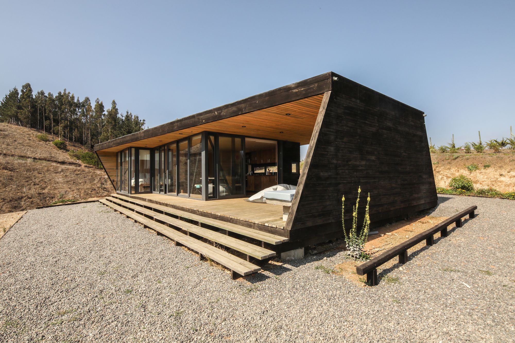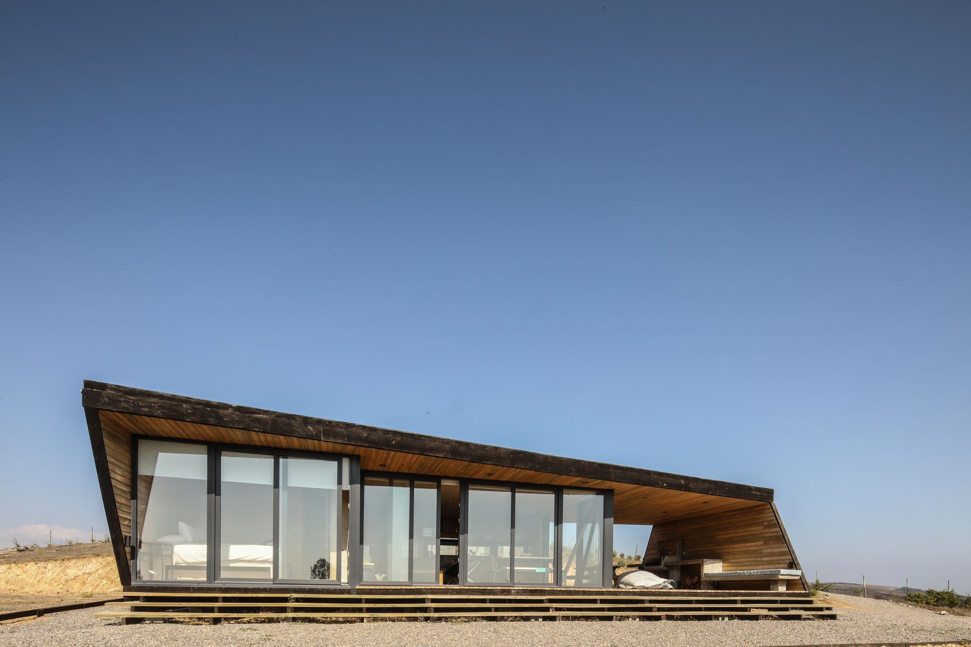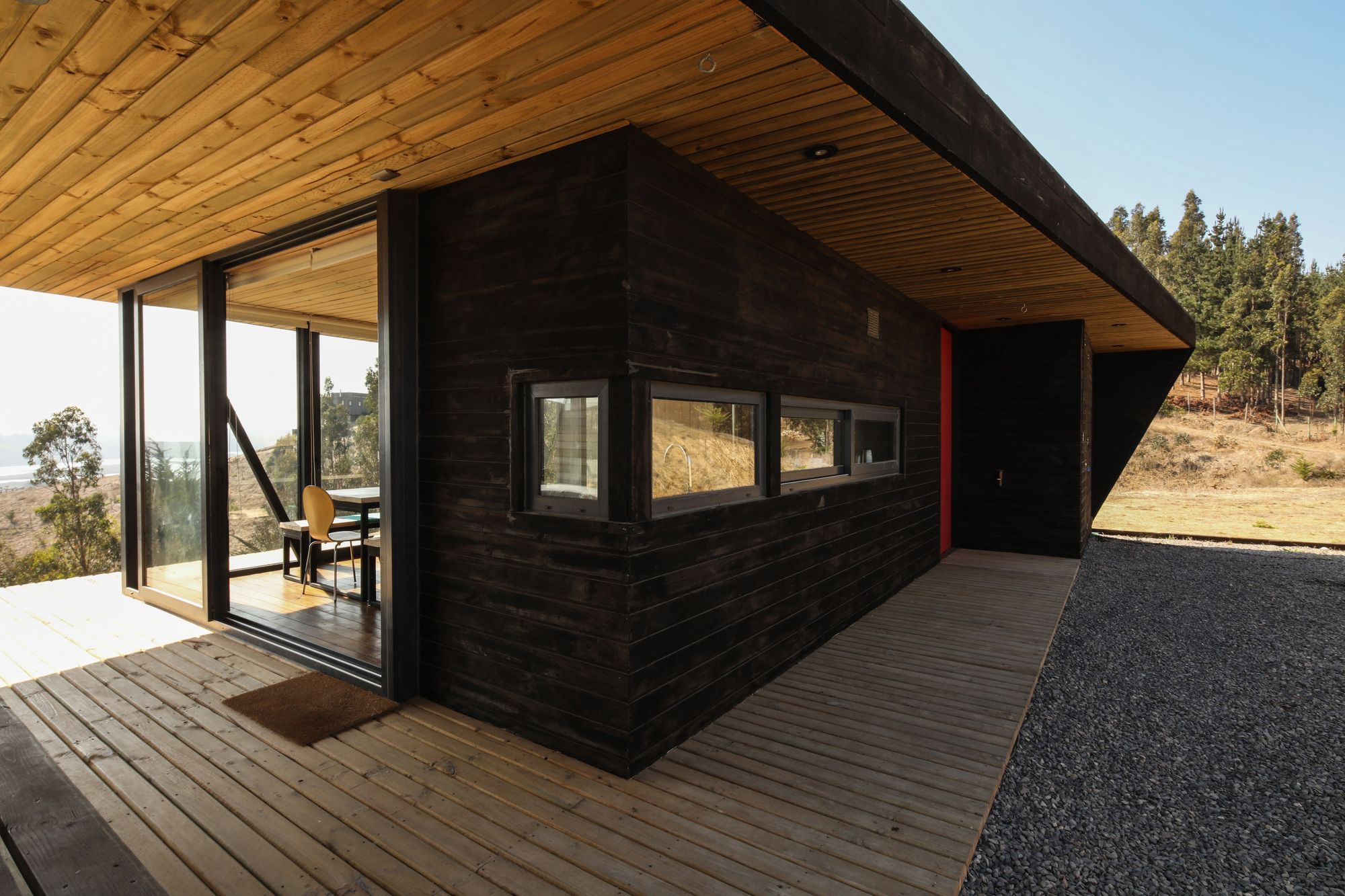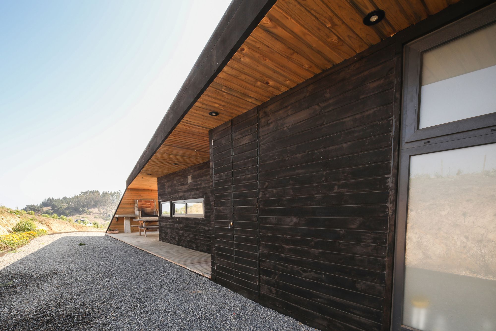 The site is at the top of a hill, we chose to place the house a few meters below the top, taking advantage of the hill as a natural protector of the south wind. In addition, a closed terrace was developed that protected from the sun and setting wind, a location that also directs the view towards the main landscape, the Rapel River. The material chosen was impregnated pinewood, both for the structure and for the cladding. The pine wood is an abundant material in the area and often used among local workers. It was thought from the beginning to have large windows with north orientation (privileging view of the landscape and abundance of sun) plus a facade with small openings to the south, thus reducing thermal losses.