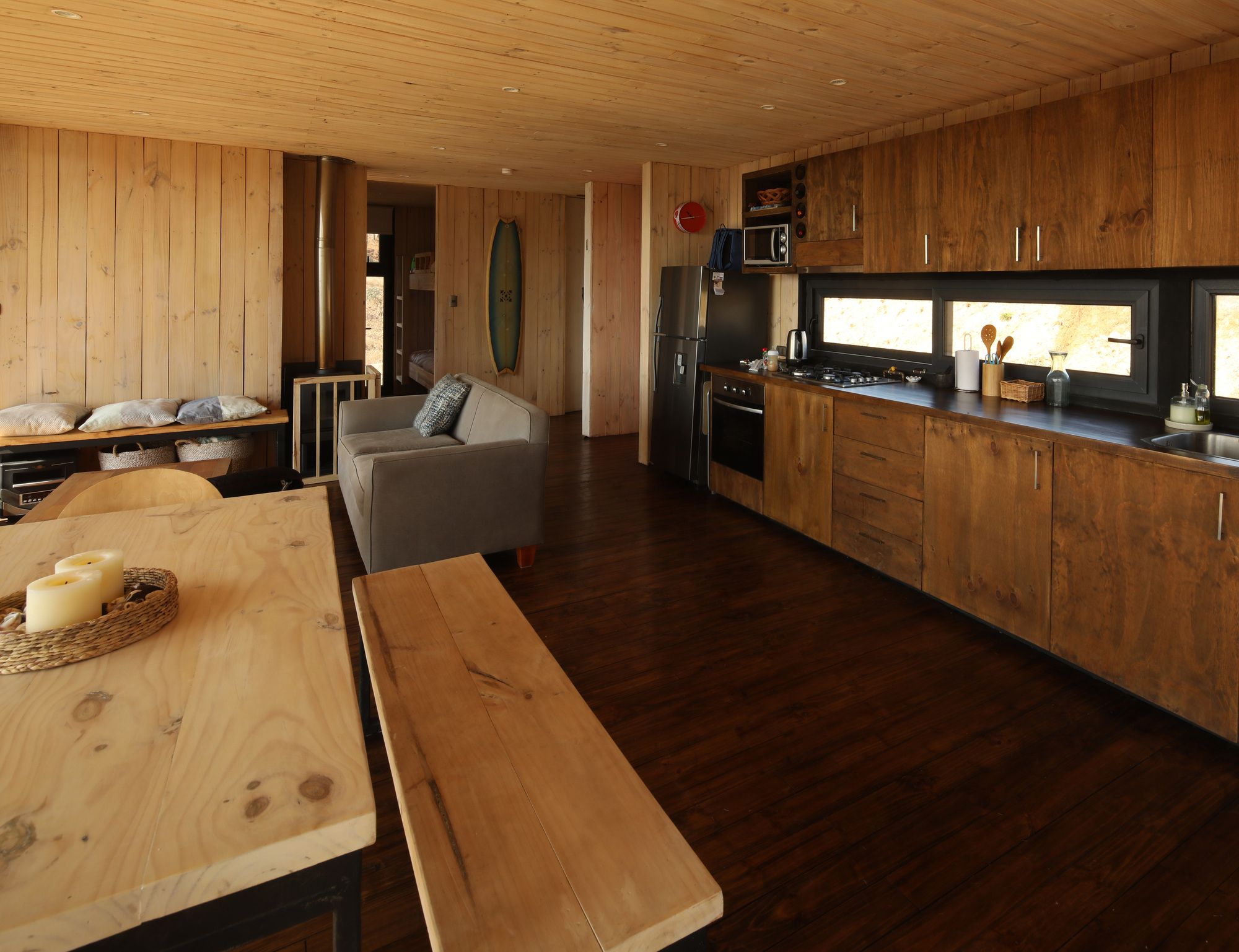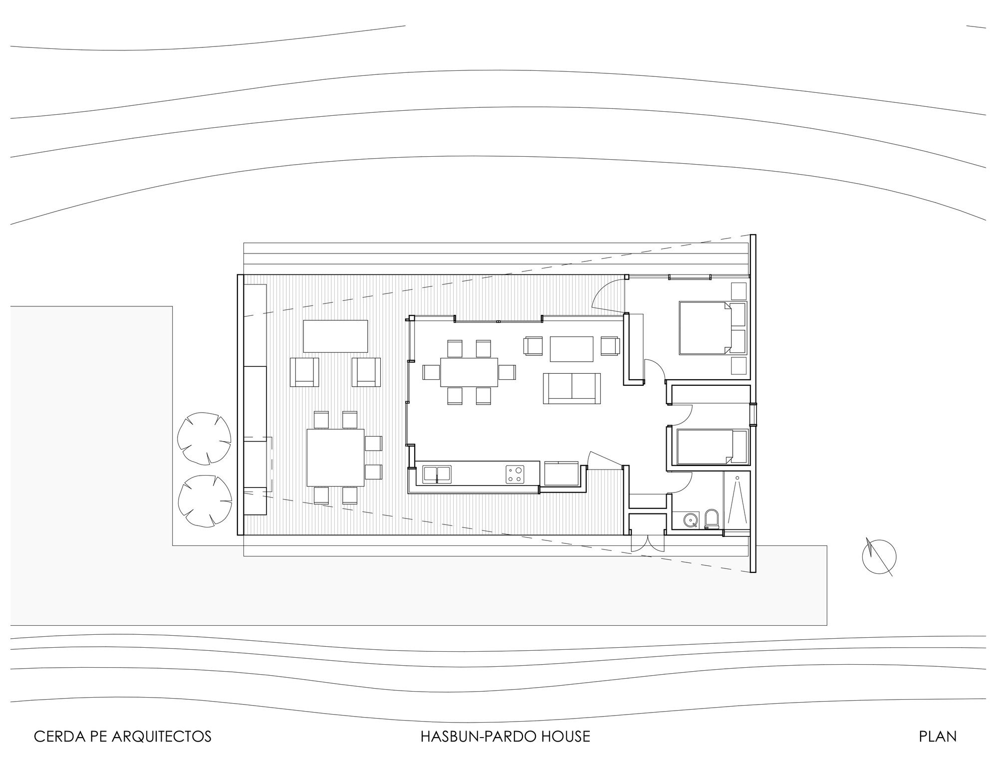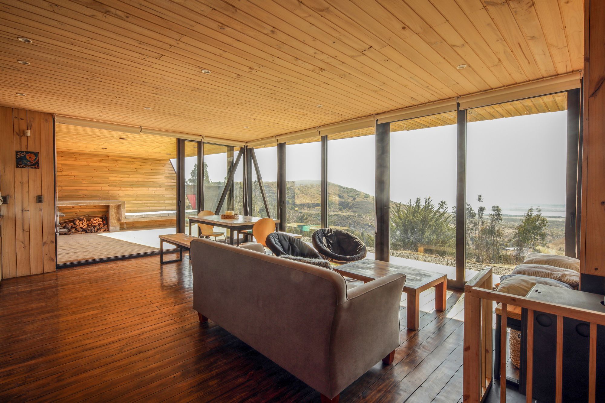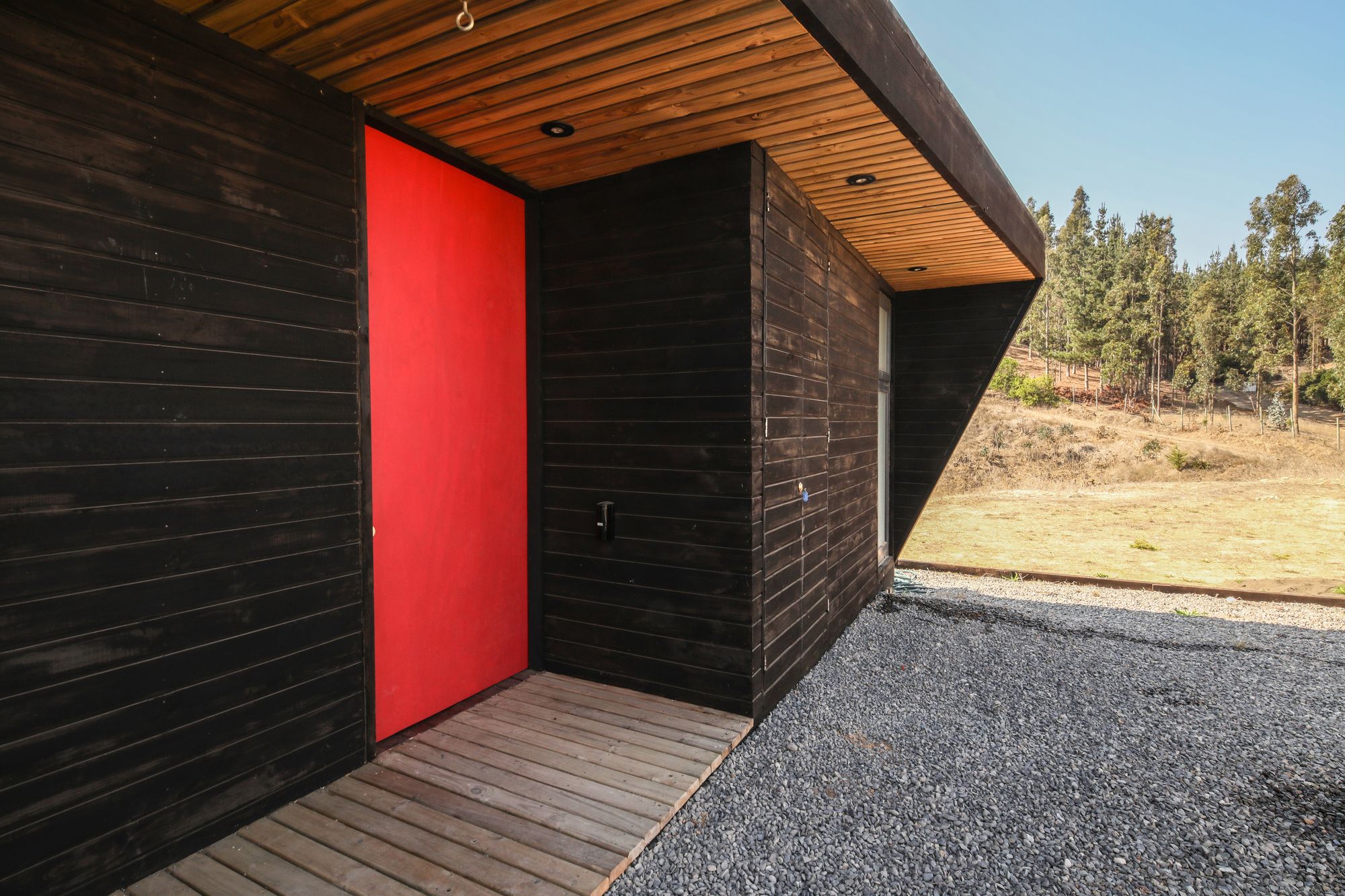 The site is at the top of a hill, we chose to place the house a few meters below the top, taking advantage of the hill as a natural protector of the south wind. In addition, a closed terrace was developed that protected from the sun and setting wind, a location that also directs the view towards the main landscape, the Rapel River. The material chosen was impregnated pinewood, both for the structure and for the cladding. The pine wood is an abundant material in the area and often used among local workers. It was thought from the beginning to have large windows with north orientation (privileging view of the landscape and abundance of sun) plus a facade with small openings to the south, thus reducing thermal losses.