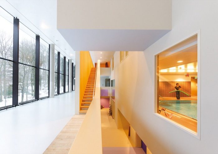 The arrangement of the programme is clear. Below are offices, above are the clinical area’s and on the roof a Ronald McDonald House with its own identity. The double-height ground floor at the entrance level facilitates the special elements of the programme such as a sports facility, fitness, swimming pool, restaurant and theatre. Not only patients but also family members and members of the local community (schools, theatre groups etc) use these facilities on a regular basis. As a result, both patient and building are placed at the centre of the community.
