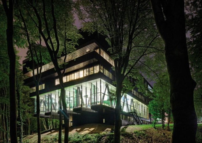 Full height glazing along the central space connecting the various different internal elements of the building ensures an almost seamless continuity between interior and exterior. The meandering facade in the restaurant results in a building in between trees and invites the forest inside the building. The surrounding nature has a strong visual and tangible presence everywhere in the building; it allows the user to revalidate whilst walking.
