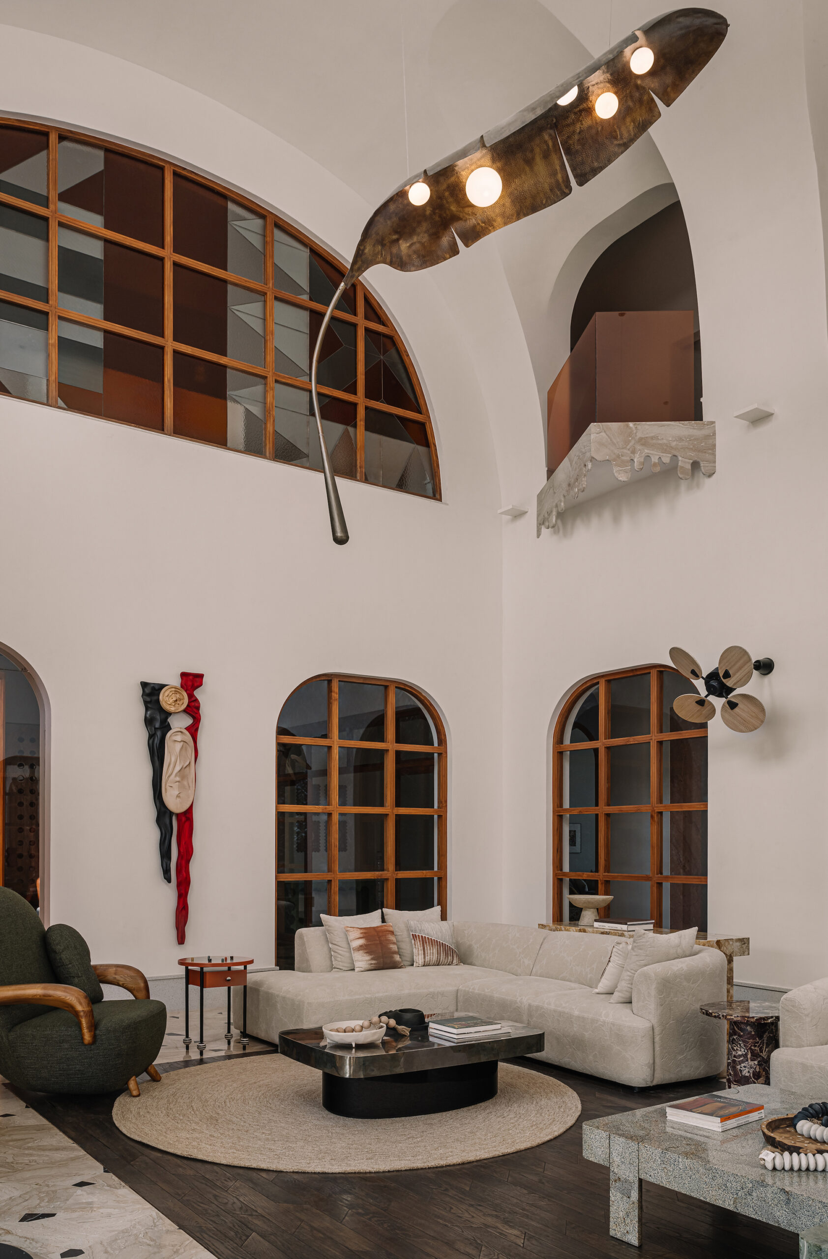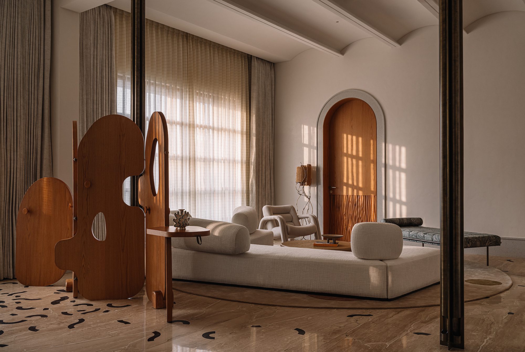 Talking Transition – Corridors and passageways have been conceived as gallery-esque spaces, indulging in an interplay of scales, geometry, and light. They pose as veins of connections, rivers of beige marble embedded with chunky brown stone inserts. The vaults and culled-out ‘hoods’ over doorways are treated with dual-toned hues, iterating depth and a grotto-like feel with indirect lighting. Interjecting the corridor in nodes are sculpture-holding vitrines — a translucent membrane that allows the gaze to peer into interconnected spaces.