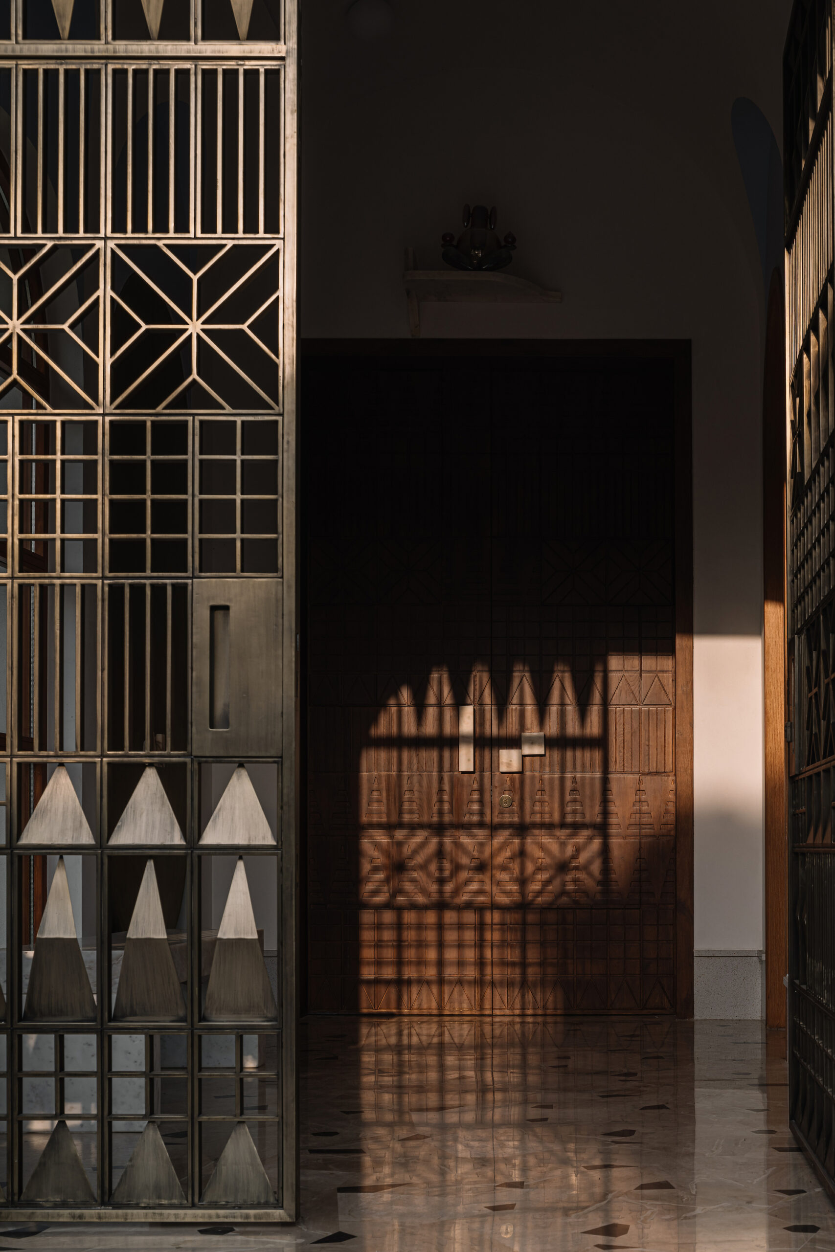 Roots Interpreted – Elements throughout the residence are subtle odes to the rich trove of artisanship that the state of Gujarat is revered for. A brass lattice entrance evokes Kutch textile motifs, drawing in dappled daylight. This leitmotif is mirrored as relief work over the wooden main doors, binding the transition spaces visually.