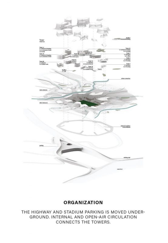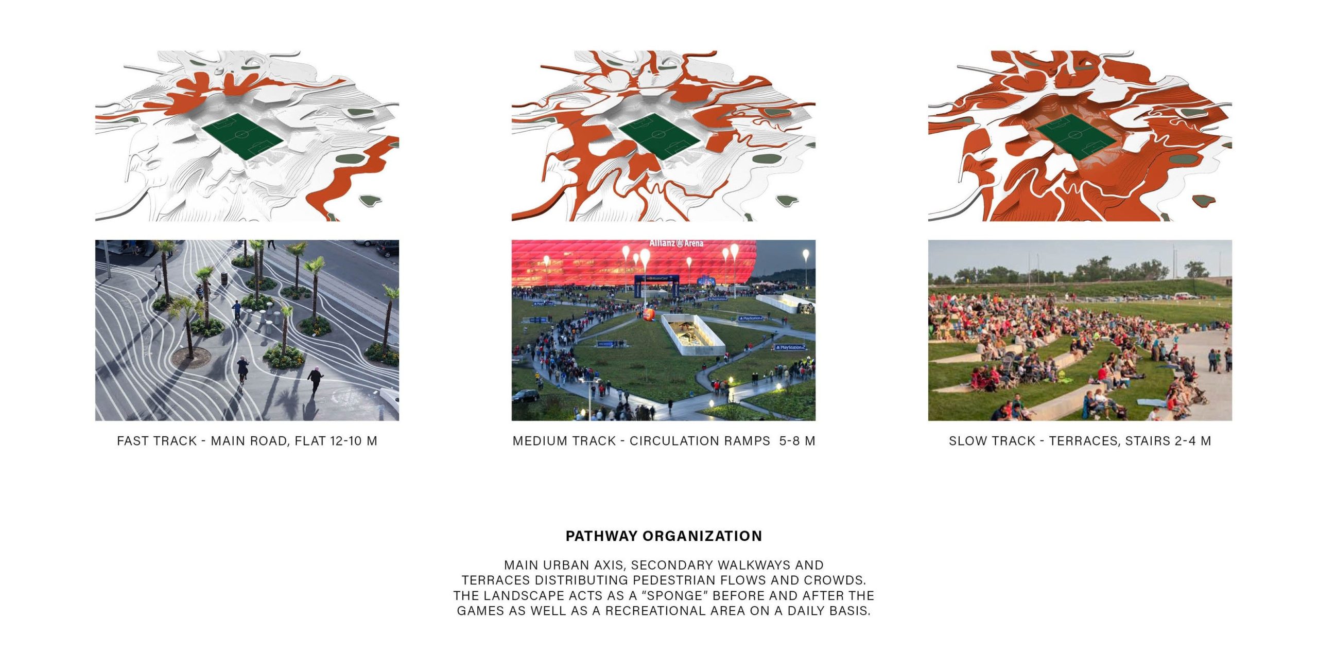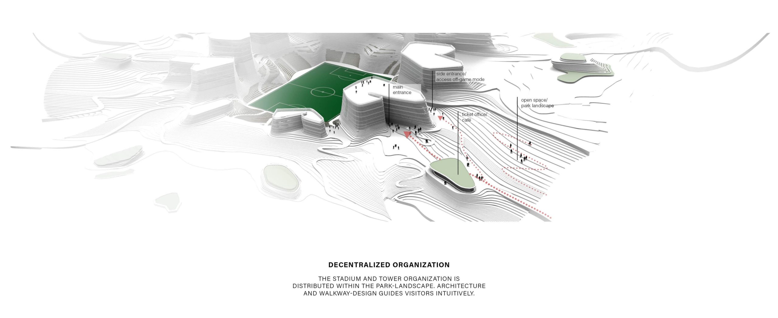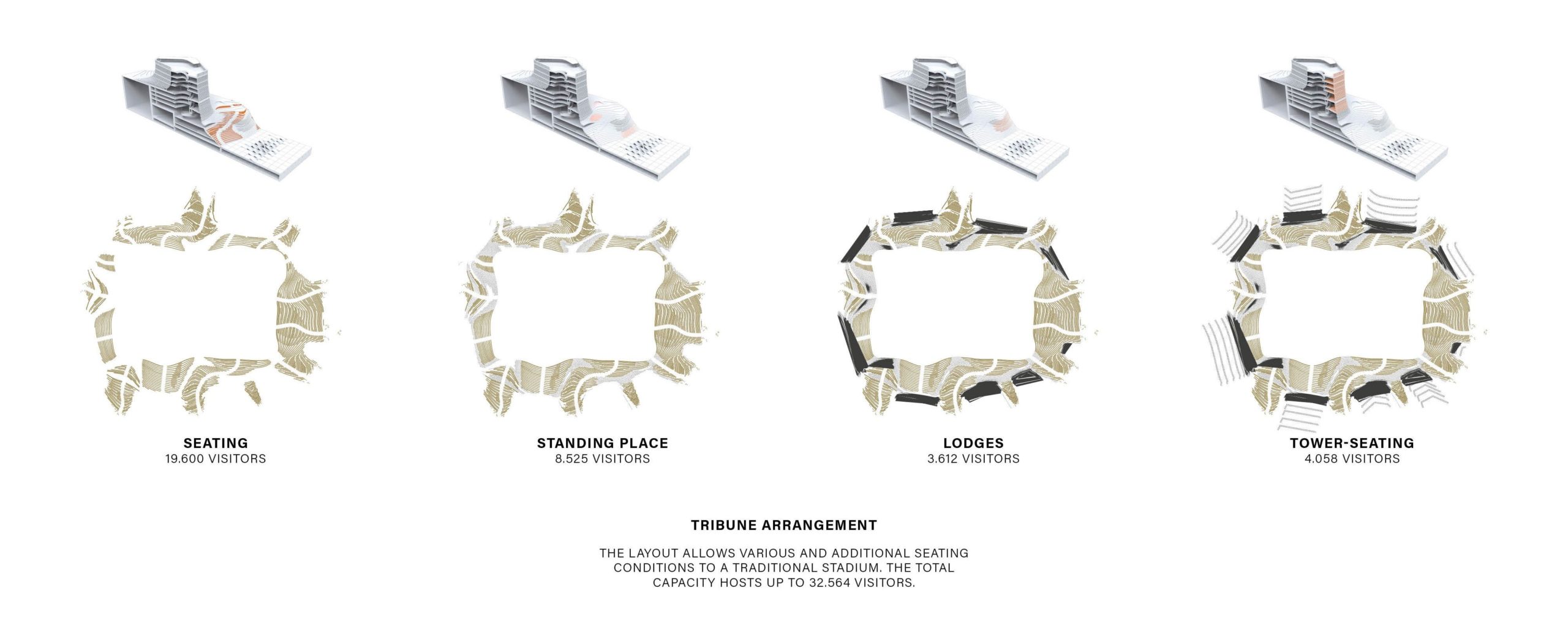 Just like old marked squares, the stadium consists of a particular organization of buildings, establishing a new type of public space that attracts both cultural as well as sporting events for a intense atmosphere. By hybridizing public space and an urban center with a stadium as its core function, the classic stadium typology transforms into a new urban development that can be better accepted by the public, resulting in a positive experience of concerts and sports events.