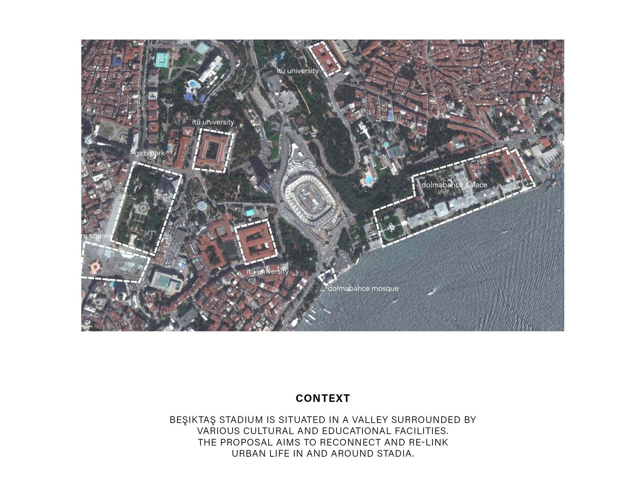 stadiums and their surrounding context. The context may be either urban or natural but contemporary stadiums are often found to be disconnected islands within their surrounds. In addition to their enormous footprint stadia also require large parking spaces, public infrastructure and other service spaces. Due to these spatial requirements entire neighborhoods are adversely affected by the addition of new stadia.
