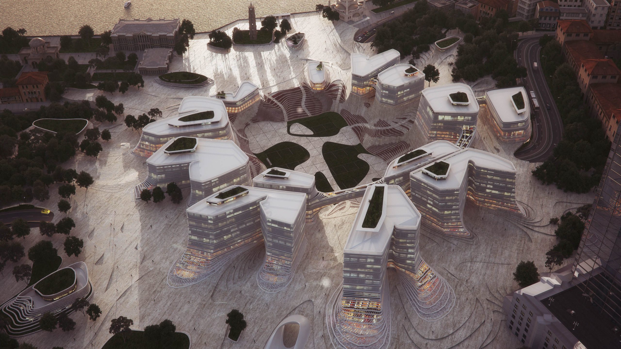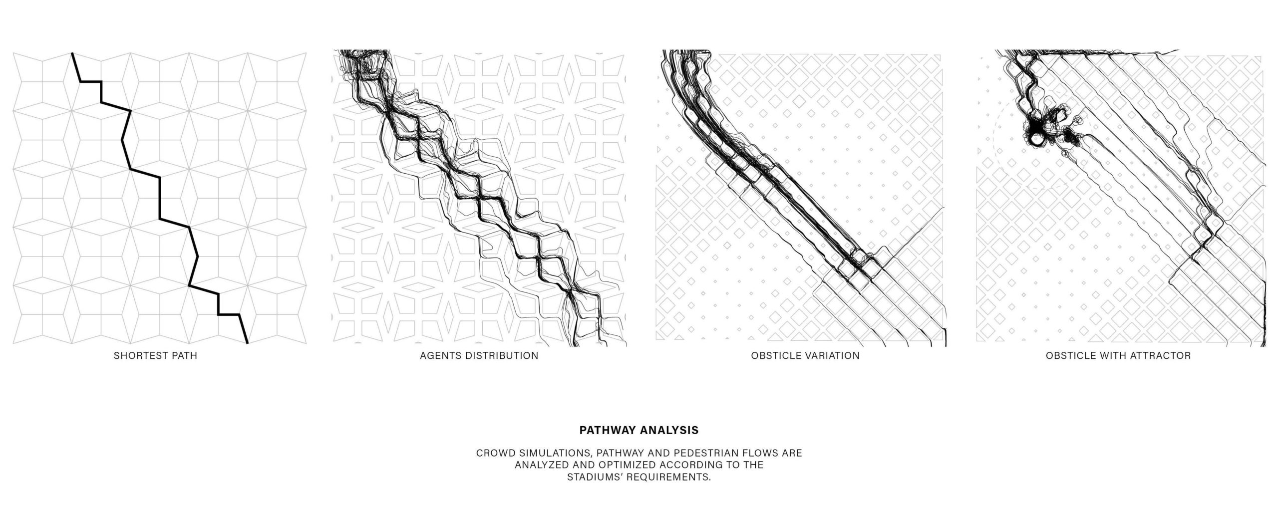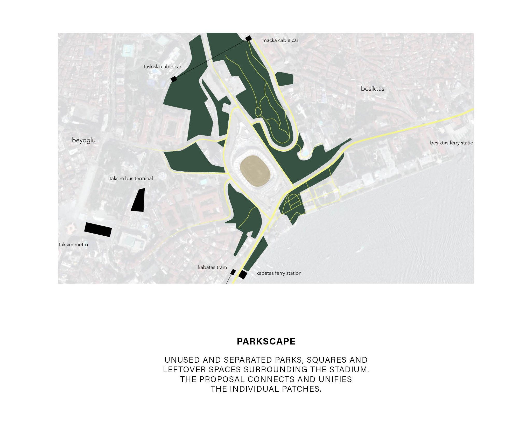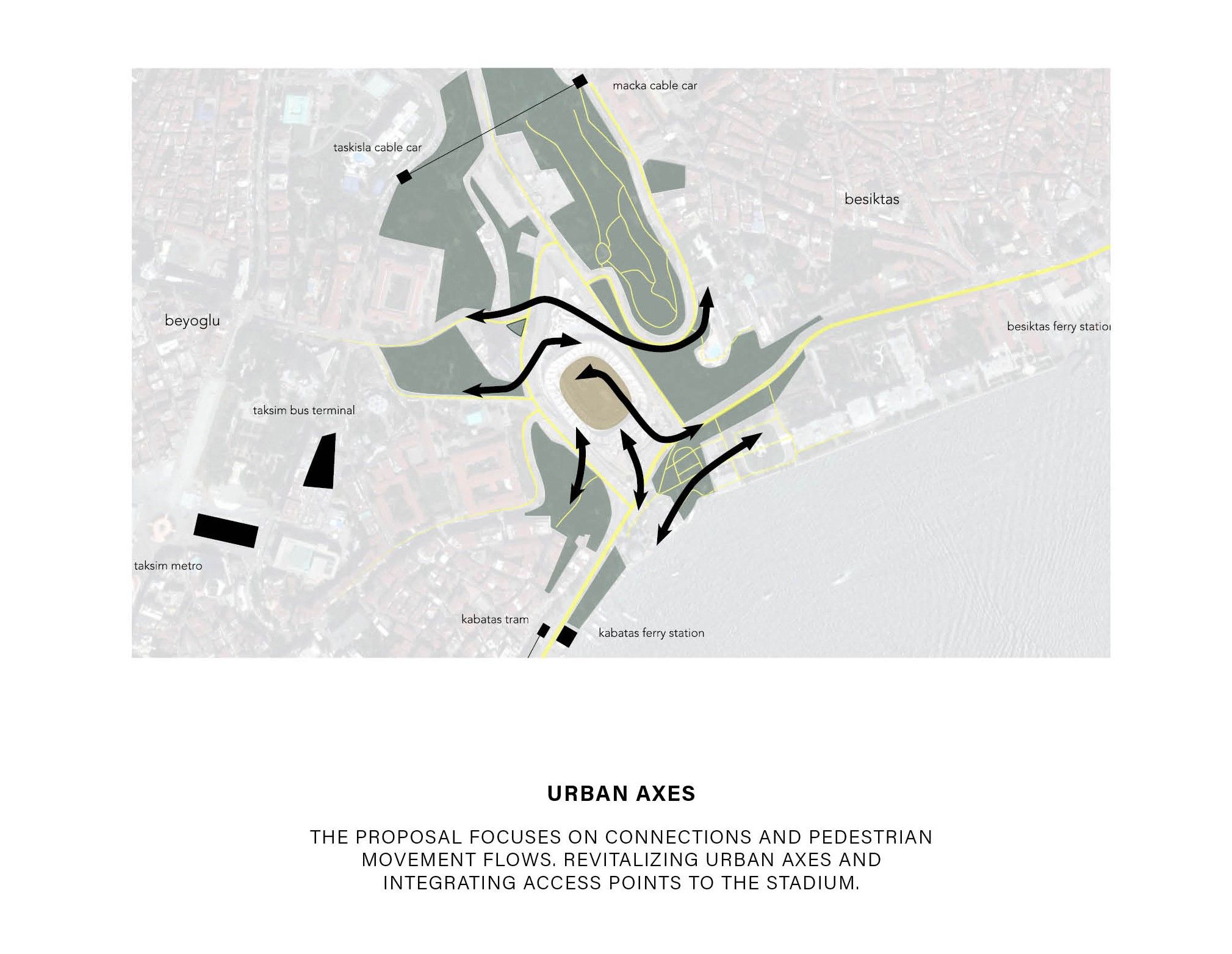 The project aims at developing a system that deals with the long-term integration of the Beşiktaş stadium in Istanbul. A stadium can be more than just a space for hosting events from time to time, rather it should be both an urban park and social hub with an architectural program. Main urban axis are activated and linked to the stadium. Using crowd simulations, pathways and pedestrian flows are analyzed and optimized according to the stadiums’ needs. The traditional typology fuses with the surrounding buildings and creates a new city center with the soccer field as its center piece. The tribunes and field can be transformed to be used 24/7 as a public space for the newly established neighborhood.
